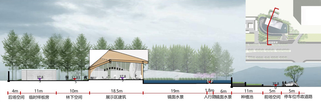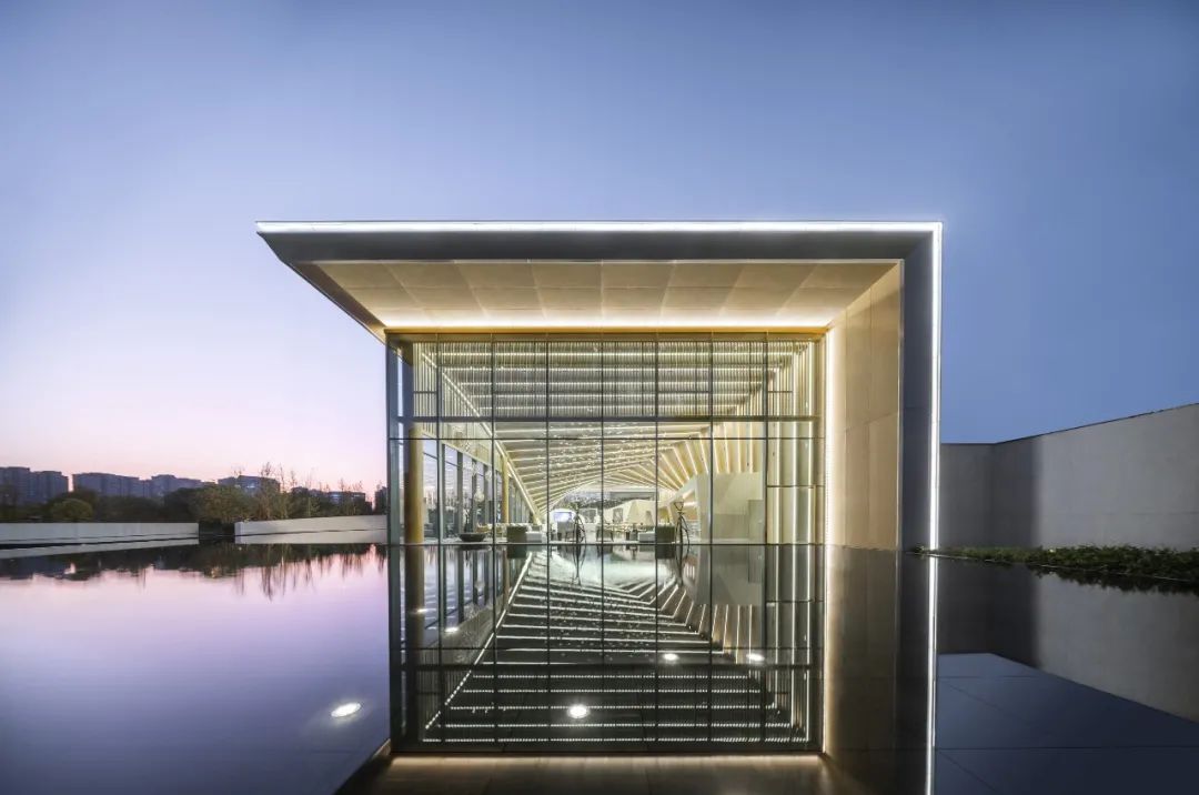 设计师运用曲水流觞的静水面设计,大面积半人高的可穿越的水景,抬升后的水面和建筑融为一体,曲线的坡道亦是形体的自然延续。宽敞的水景屏蔽了周边杂乱的环境影响,旨在让人们逐渐离开城市的嘈杂和喧嚣,给人以渡水穿云的奇特体验。