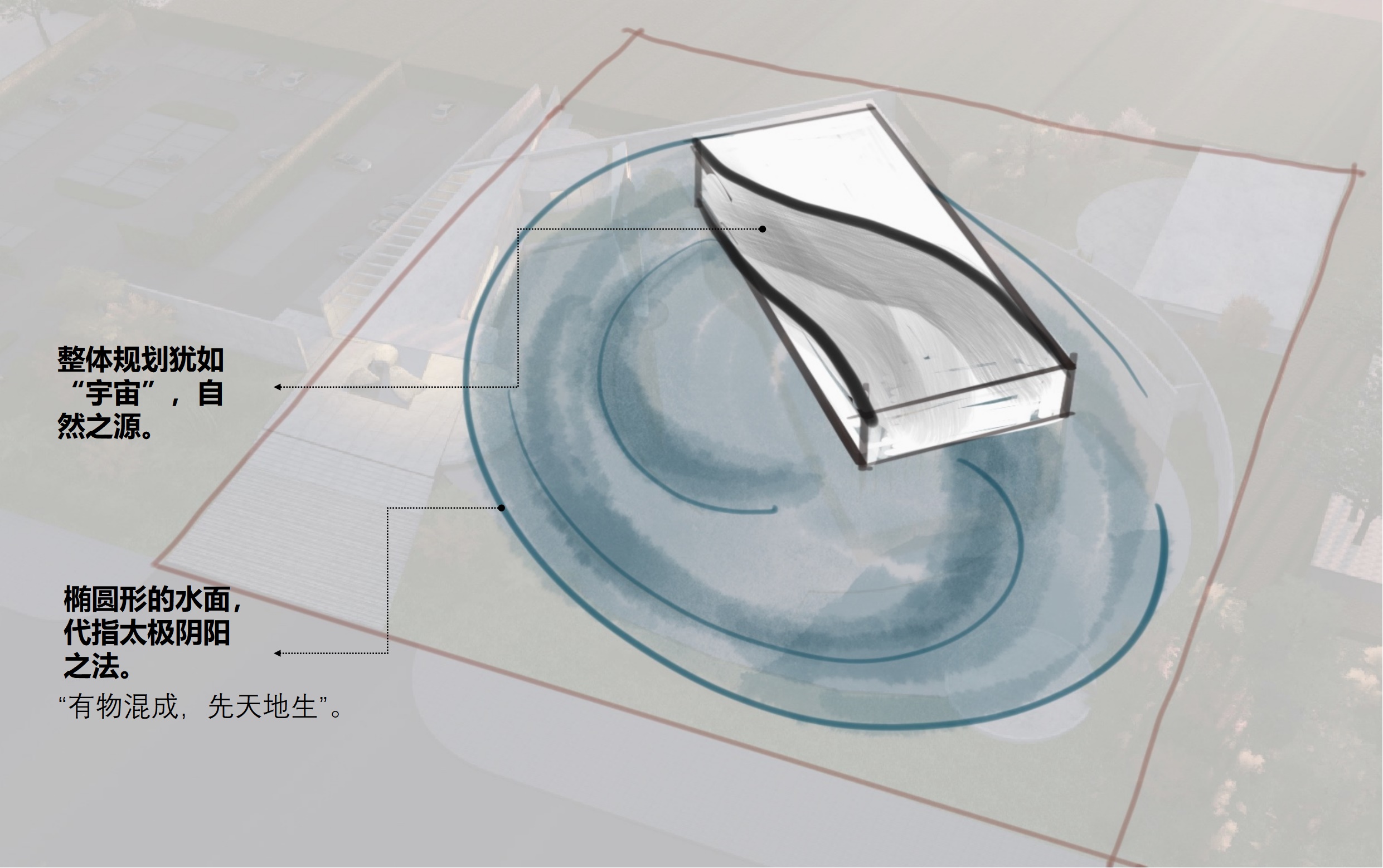 “思虑静后至德不去,孔窍虚乃有气入”,要先知道“虚”,之后才能够了解什么是“实”,要先明确“静”,之后可以清楚“动”。本案设计理念来源于中国道家的“太极”,整体以最极致的方形扭转后,自然的曲线柔化了建筑原本界限分明的阴阳面,形成屋顶和墙面的自然延续。与直线性的建筑相比,曲线传递出来的更多的是对自然意象的转化和寄托。