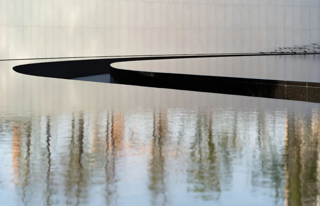 银灰色幻彩铝板的在日光下,使得建筑表皮的部分物质属性消失了,凸显出充满张力的曲线线条,镜面水的引入更激起了无尽想象的空间,整个过程自然光线的变化无比生动。
