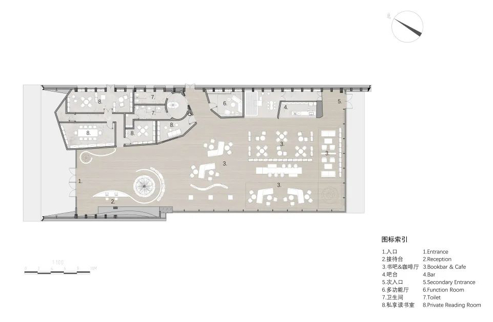 我们将功能性的房间布置在一侧以隔断遮挡,留下一个高大宽敞的大厅作为书吧和咖啡厅,避免了空间割裂感。大面积的落地窗将自然光引入室内,营造空间序列。设计师利用空间中光影强度的变化,使空间产生差异化,当人们在此阅读交流时,便可以感受到光旋律变化所带来的富有变化的空间序列层次。