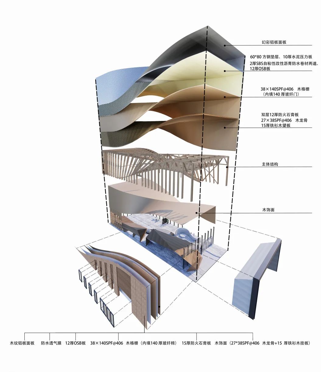 落地窗与屋面的界限由扭转的曲线分开,优美的形态在建筑体量上增加了活泼的动感,拟合曲线的螺旋木构骨架是对自然意向的转换——仿若人类本源基因序列的扭转之舞,让人感受到生命的力量。