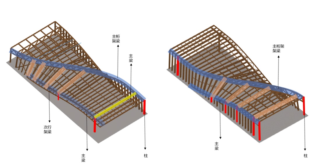 由于设计师是将长方体建筑进行了扭曲,抽空其中一个纵向面的门架柱,室内空间高度、门架梁的呈现效果、扭转角度等有较为具体的要求,使得结构实现变得极有挑战。且设计师希望呈现出一个完整的木结构,不外露任何钢构,因此常规的梁柱结构体系已难以解决本案结构要求。结构师通过与各专业需要进行充分沟通及全盘考虑后,在结构实现上重点抓住“一柱一梁一脊一面”的特点,将渐变的扭曲骨架与室内外两条“S”型脊线进行了完美结合。将建筑要求的“独立”“大跨”“悬挑”“扭转”“曲面”“通透”“全木结构”展现的淋漓尽致,也使得钢、木结构进行一次亲密无间的结合。