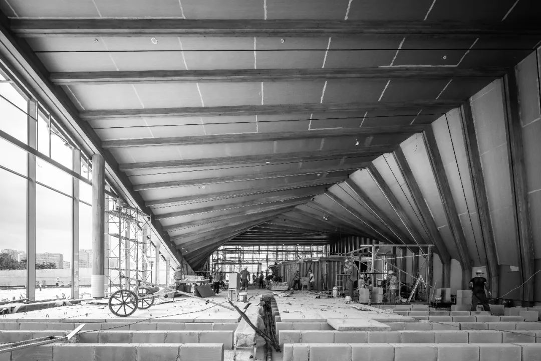 Because the designer twisted the cuboid building and evacuated one of the longitudinal gantry columns, there are more specific requirements for the height of the indoor space, the presentation effect of the gantry beam, and the torsion angle, which makes the realization of the structure extremely challenging. And the designer hopes to present a complete wood structure without exposing any steel structure, so the conventional beam column structure system has been difficult to solve the structural requirements of this case. After full communication and overall consideration with the needs of various disciplines, the structural engineer focused on the characteristics of "one column, one beam, one ridge and one side" in the structural realization, and perfectly combined the gradual distorted skeleton with the indoor and outdoor "s" shaped ridge lines. The "independent", "long-span", "cantilever", "torsion", "curved surface", "transparent" and "all wood structure" required by the building are displayed incisively and vividly, and the steel and wood structures are closely combined.