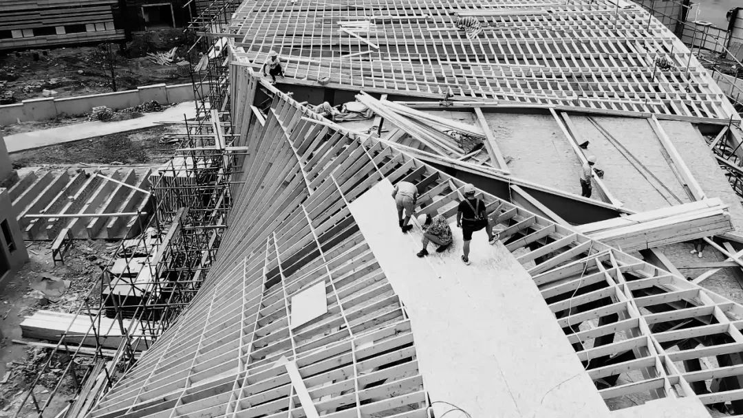 本案扭曲面利用木结构龙骨间距关系,将一个扭曲屋面安装300mm的间距进行片块化切分,每一个扭曲尽量做少量变动,再利用15mmOSB板自身的板型及承载受力特性进行定性弯曲。才将结构扭曲屋面进行了初步定型,为了满足最终呈现完全扭曲自然及铝镁锰的安装平整面的要求。我们在初步定型的结构基础上再根据300mm网状定点的办法再进行一次12mmOSB板的安装才得以最终呈现。