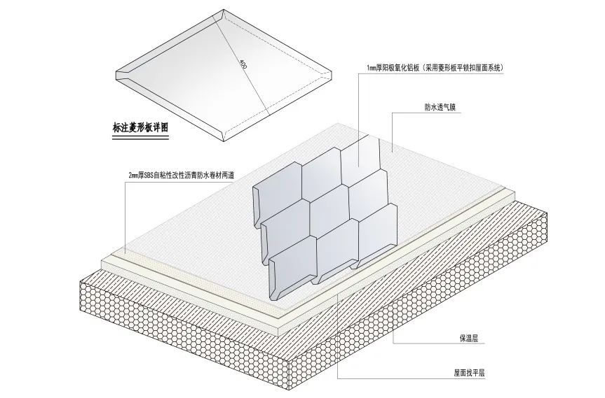 由于建筑是双曲面屋面,且屋面与墙面形成统一一个面,若不在材料运用上必须充分结合材料本身的特性,则很难实现。如结构就不能采用混凝土结构,屋面瓦不能采用长条状的铝镁锰等。