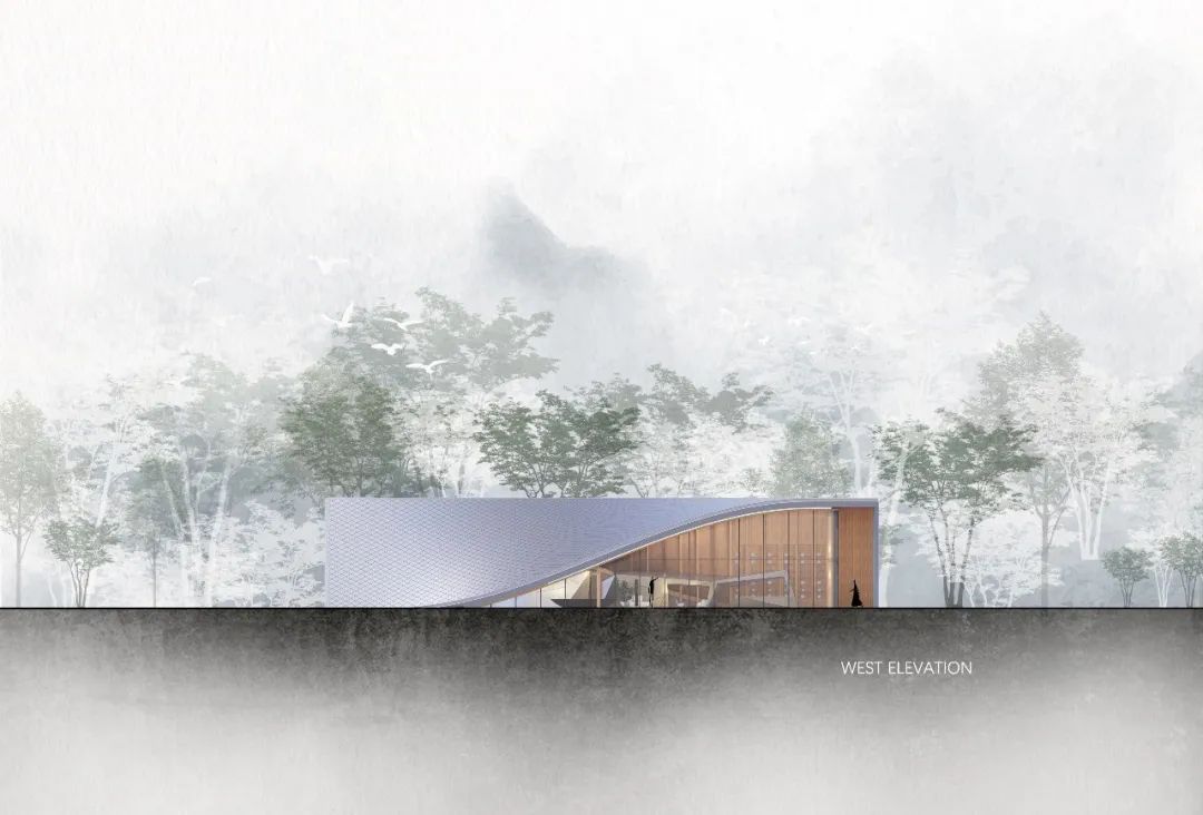 建筑两面临水,因此通透的玻璃幕墙延展了空间,模糊内外边界。这是一种相互贯穿和相互渗透的关系,赋予空间视觉一种透明的现象。长边的玻璃面与金属屋面通过体块扭转形成的优美弧线自然分割,同时也分割了立面的虚与实。