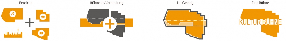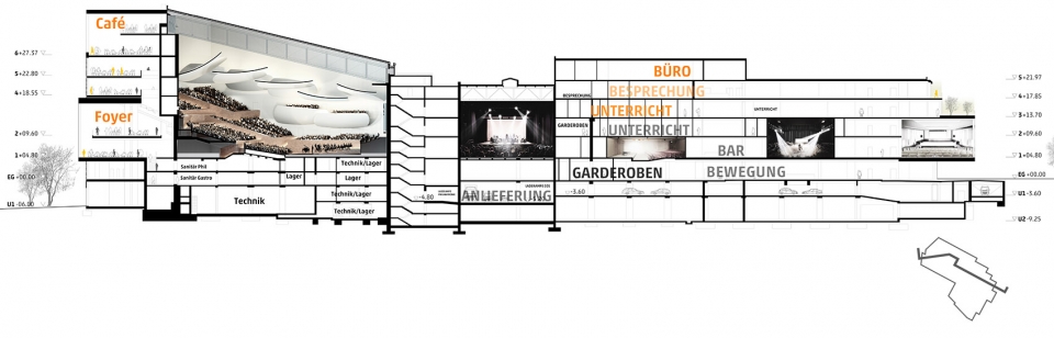 Once inside, two wide staircases, which are partly formed as seating podiums, lead up to the first upper storey – the centrepiece of the Cultural Stage. This is where all of the foyers to the large auditoria are located, together with the accompanying catering and bar areas, as well as the exhibition and event spaces. A major factor in new proposal is that it meets a number of goals in synchrony: the Philharmonic is refurbished to create an optimal acoustic and spatial experience; the multifunctional Carl Orff Auditorium is re-designed to become the most flexible space in the Gasteig; the layout of the library transforms it into an open reading and studying land- scape; and the MVHS – including its information and advice areas – is housed running along the length of the Cultural Stage. Finally, located above the Philharmonic, the new Ausblick restaurant forms the vertical conclusion of the Gasteig, offering its guests a panorama view stretching from the Allianz Arena, past the Frauenkirche and out to the Zugspitze.