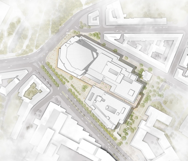 The open-air installations of the new Gasteig are conceived as interlinking elements, dissolving the previous markedly built-up and barrier-like design, and thus formulating a prominent connection between the new cultural space of the Gasteig and its adjacent urban surroundings. The heart of the outdoor layout is a broad and imposing set of steps, which opens the Gasteig up facing Rosenheimer Straße and above all towards the River Isar. It is a lavish gesture, allowing all of the spaces to flow into one another as if naturally. The high quality of the materials deployed, for instance bright natural stone, reinforces the light character of the layout. Trees set as single solitaires provide a subtle greenery and natural shading in summer. They are framed by minimal tree grates, integrating them seamlessly into the otherwise flowing circulation space. Particular species are to be planted, for instance Sweetgum trees, chosen in order to introduce a controlled colour accent to the public space. The long stairway steps are designed to stage a graceful measured approach towards the entrance area of the Gasteig. Their flowing edges run in a sweeping line outwardly from the new building, coalescing to form a bundle at the southern-most end where the steps assume the dimensions of conventional outdoor stairs. In order to keep the entire sweep barrier-free a stair ramp is integrated into the layout towards the east. The second entrance on the east side of the new building enables easy access to the train system, where again an open and barrier-free space is created that appears to flow directly into the building. At the eastern edge of the site a “green carpet” is metaphorically rolled out for visitors and guests, signifying the entrance to a special realm. It is planted flush with the floor with shade-resistant ground cover plants and shrubs, which arranged in meshed rows form a path from west to east. The pattern of the “green carpet” is revealed to visitors standing above in the glazed gallery, forging a further visual relationship between inside and outside. The choice of material characteristics of the open-air layouts – defined by high-quality, dignified building materials such as natural stone and stainless steel – appropriately mirrors the rich tradition of the Gasteig’s history and its great cultural importance for Munich.