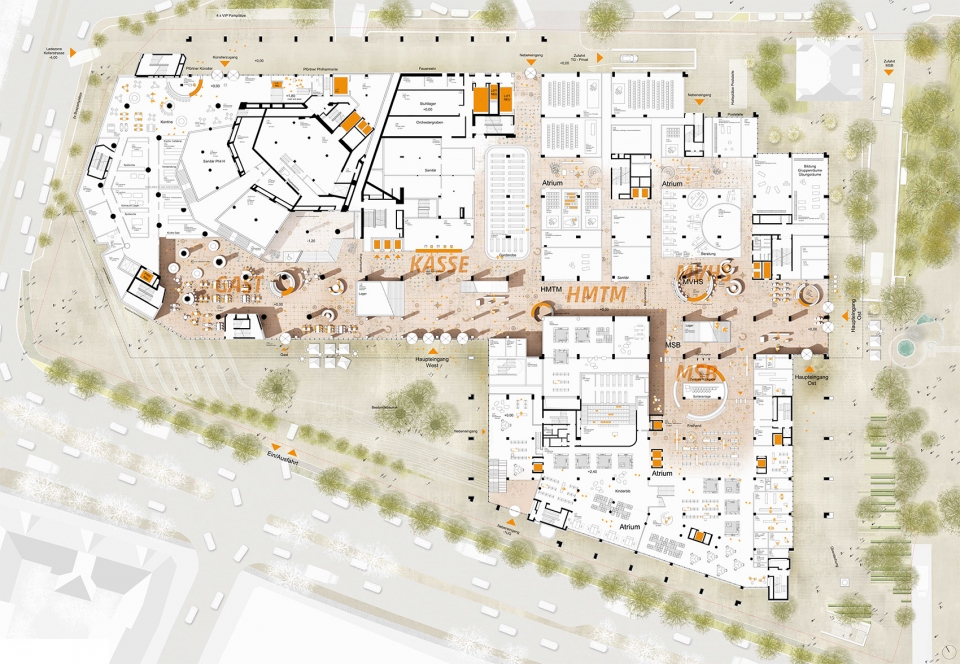 慕尼黑Volkshochschule (继续教育中心 – MVHS)有独立的位置,包括一层的信息咨询处,还有文化舞台从东到西的通路上,无论从哪个入口进入建筑都可以马上看到。MVHS由它的子中心运营,同时构成清晰的定位系统,所有的学费室配备了最现代的数字设备。空间的多样、流线的布局为音乐与表演艺术大学(University of Music and Performing Arts)和文化提升服务提供了交叉协同作用。两个宽敞的中庭为学费室和工作区提供了充足的日照。