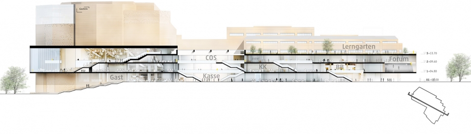 The layout of the library transforms it into an open reading and studying landscape, offering areas for both concentrated contemplation as well as communication. Following the smart working principle, and in tandem with numerous new work and study spaces, the open-access area is organised over a number of storeys. Differentiated furnishings provide the visitors with attractive places to read, research and to learn. Additional project areas and maker spaces, which intersperse the spatial continuum of the library like islands, allow a number of people to work together without disturbing the other users. The spatial enlargement of the atriums within the library provides clear spatial coordinates and establishes visual lines of association between the individual focal areas. The safeguarding and tracking of the books, tablets and laptops via a RFID system allows the library to be accessed at all levels of the “Kulturbühne” (the Cultural Stage).