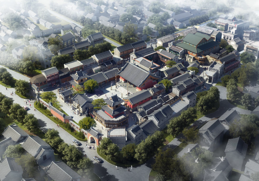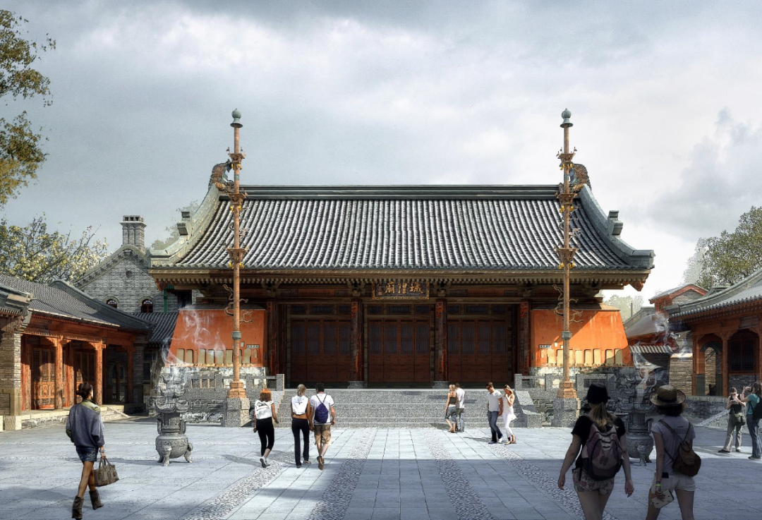 城隍庙采用青砖红色墙面,灰色瓦屋面。