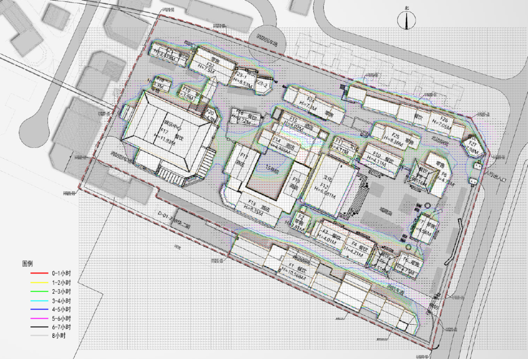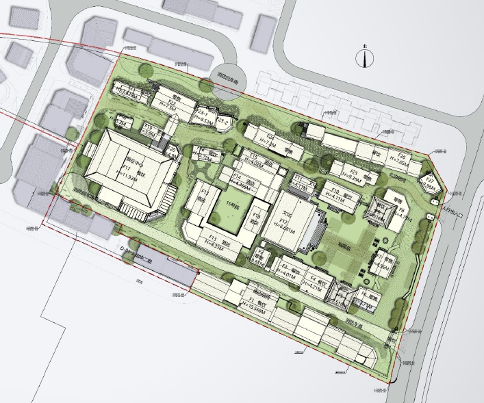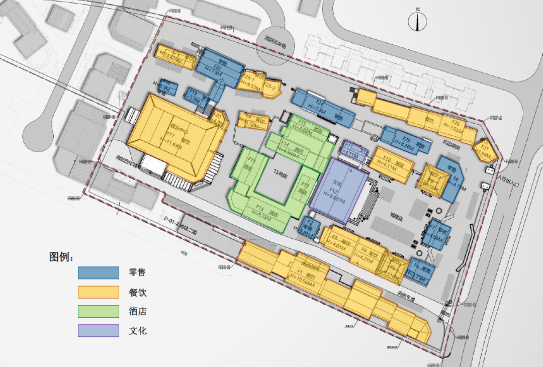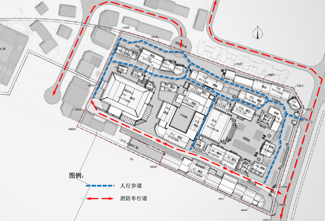 In terms of traffic design, since the main function of this project is tourism, it considers the traffic organization mode of separating people and vehicles. The traffic ways are mainly set on the east and north sides of the land, which can not only meet the passage of fire trucks, but also facilitate the transportation of photography props. Due to the requirements of fire protection, an invisible fire lane is set up inside the site. The fire lane is set in the south of the local block, and the people enter through the gates on the east and north sides for sightseeing, avoiding crossing with the traffic flow.