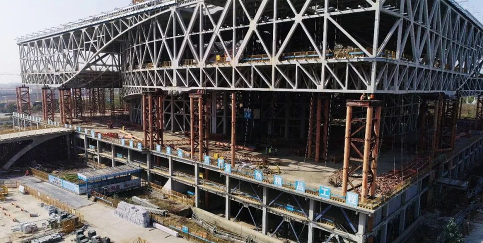 ▼湖北省科技馆钢结构卸载现场,Steel structure unloading site of Hubei science and Technology Museum