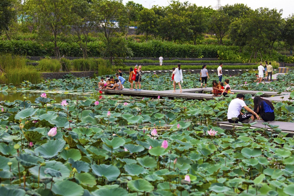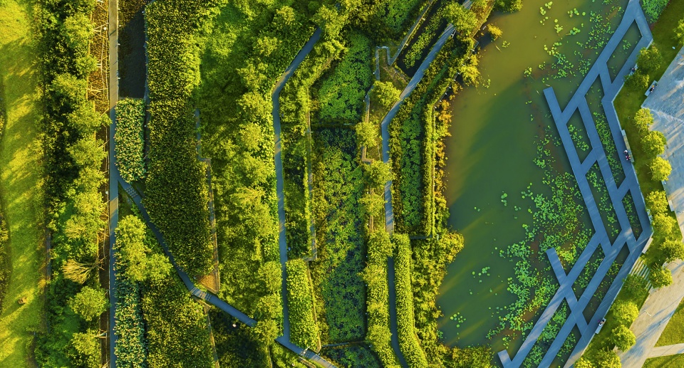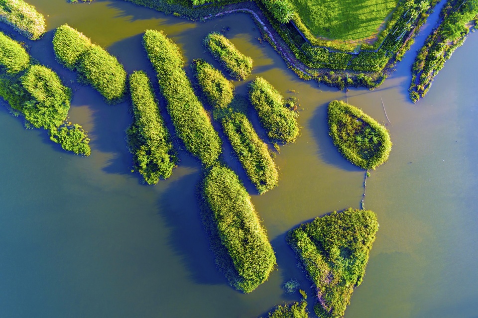 The natural beauty of Fengxiang Park is shown by the use of terrestrial landscapes such as terraces, dense forests, orchards and a chain of marsh islands