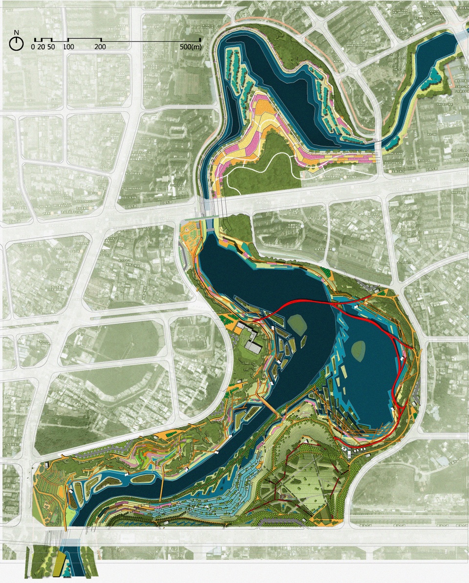 The designer proposed that the core of river pollution control is to divert rainwater and sewage. The first is to intercept sewage. The second is to arrange sponge facilities (gentle slope grassland, rainwater side ditch, ecological revetment retaining wall, and Taitian wetland) according to the concept of sponge city to achieve the storage, detention, infiltration, purification, use, and drainage of rainwater. At the same time, it also creates a river habitat of dense forests, wetlands, and shoals; Third, reduce the height difference of the existing footpath, so that people can directly get water, and set up bicycle roads to meet the experience needs of different groups.