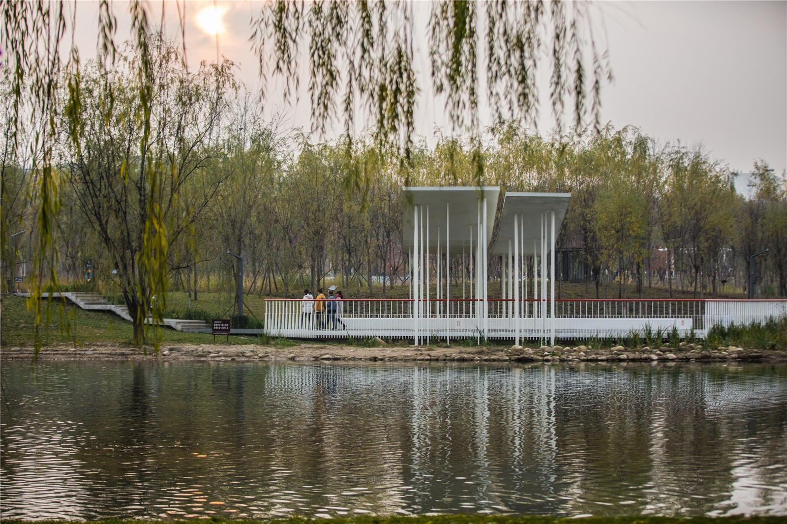c.滨水休闲区:场地潏河和樊川湖边经过土方和水系的梳理后形成良好的景观界面,可作为优质的休闲场所,设计根据场地特征,在景观较好的界面设计了景观休闲节点,其中包括潏河边的滨水景观栈道,樊川湖边的景观滨水广场,北岸的滨水挑台以及一些小型的滨水临时停留空间。让人群在休闲中可以享受亲水的乐趣。
