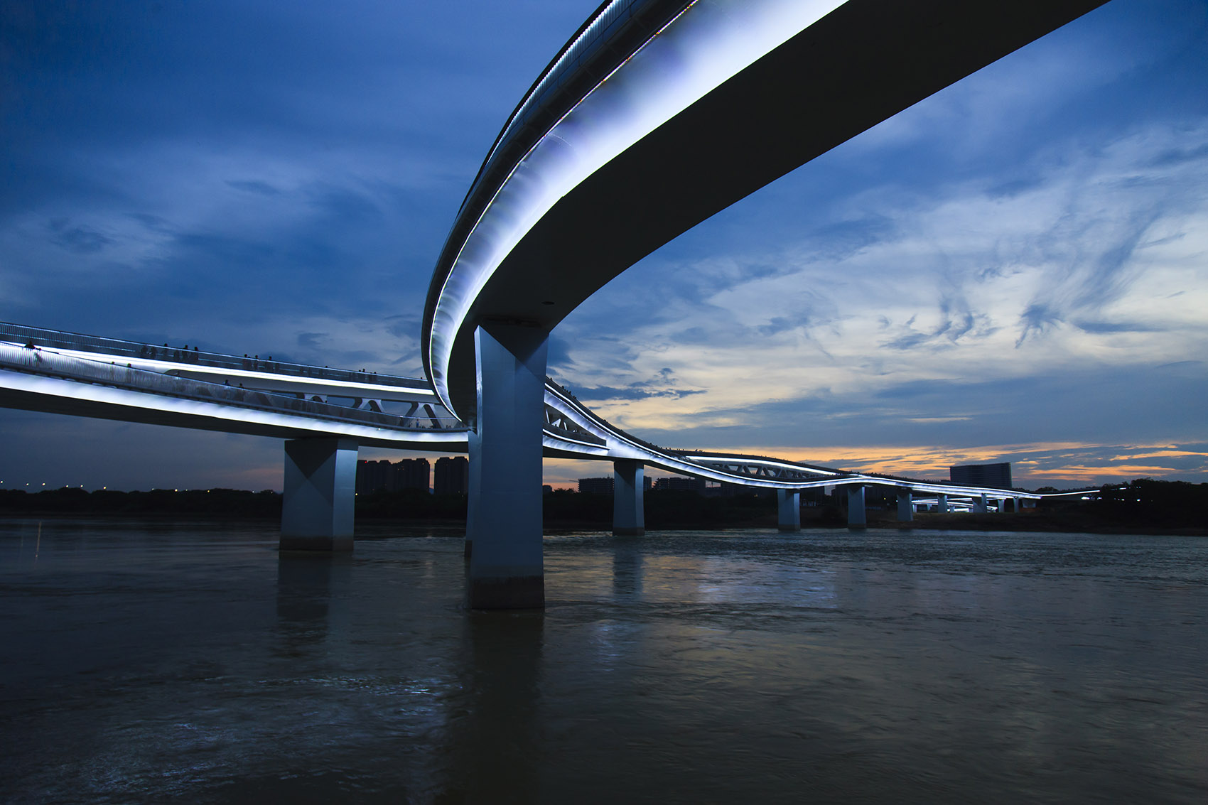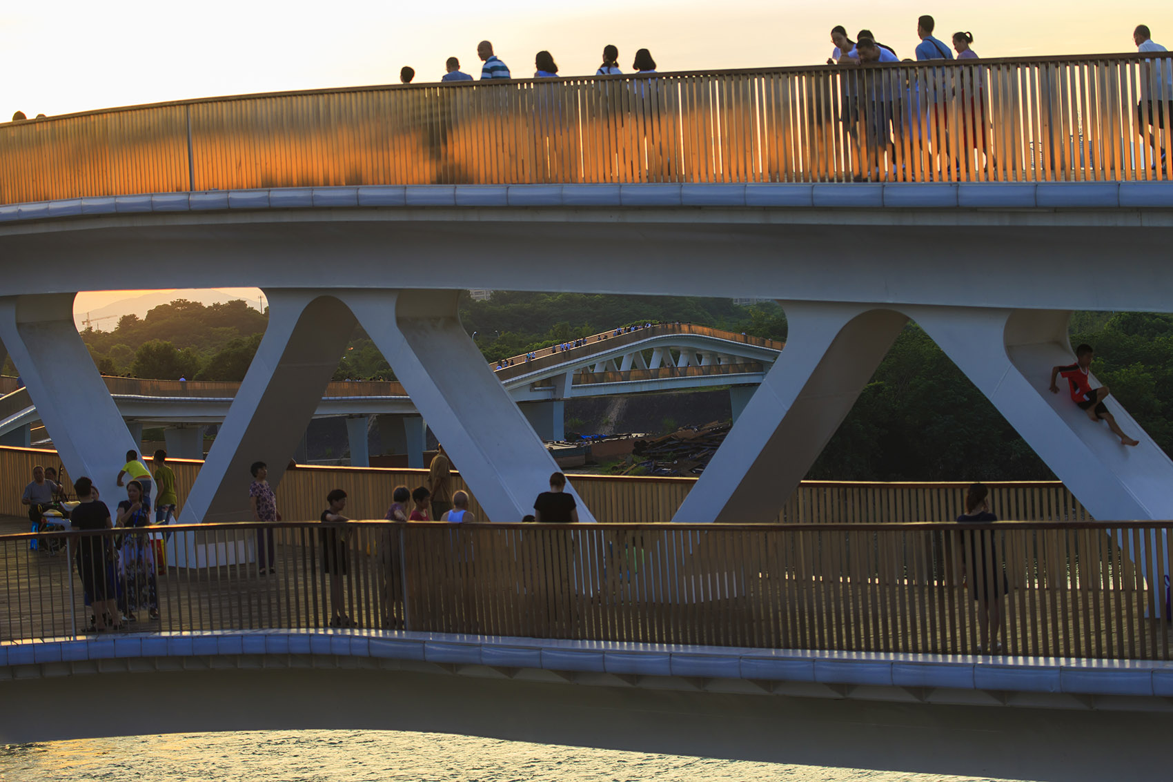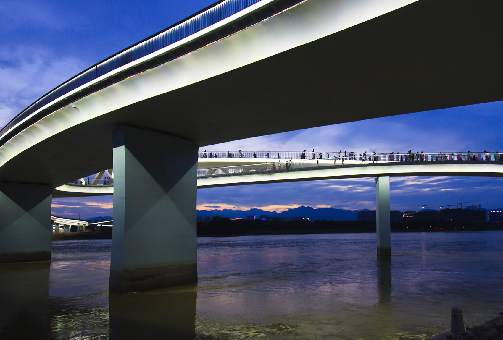 The bridge focuses on two major functions: traffic function and landscape leisure. Traffic function includes pedestrian, bicycle and electric vehicle. Pedestrian and non-motor vehicles shall be separated. Due to the above characteristics, the bridge is divided into two parts – a flat non-motor vehicle bridge and a curved pedestrian arch bridge. The two bridge decks are scattered in the spatial rhythm, and they created a beautiful urban landscape.