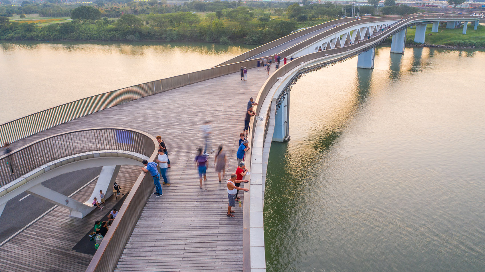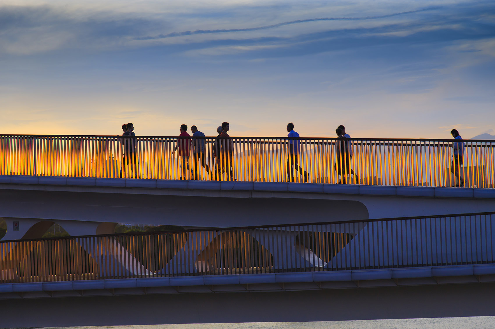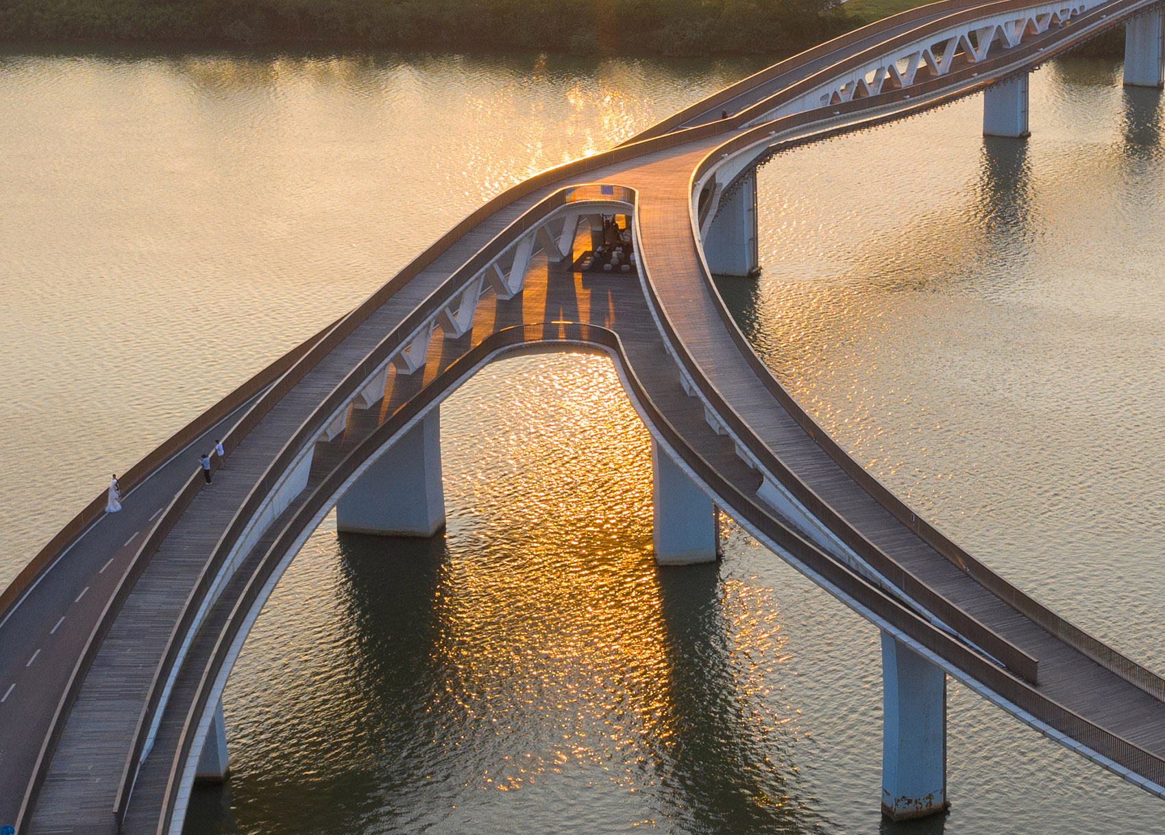The bridge focuses on two major functions: traffic function and landscape leisure. Traffic function includes pedestrian, bicycle and electric vehicle. Pedestrian and non-motor vehicles shall be separated. Due to the above characteristics, the bridge is divided into two parts – a flat non-motor vehicle bridge and a curved pedestrian arch bridge. The two bridge decks are scattered in the spatial rhythm, and they created a beautiful urban landscape.