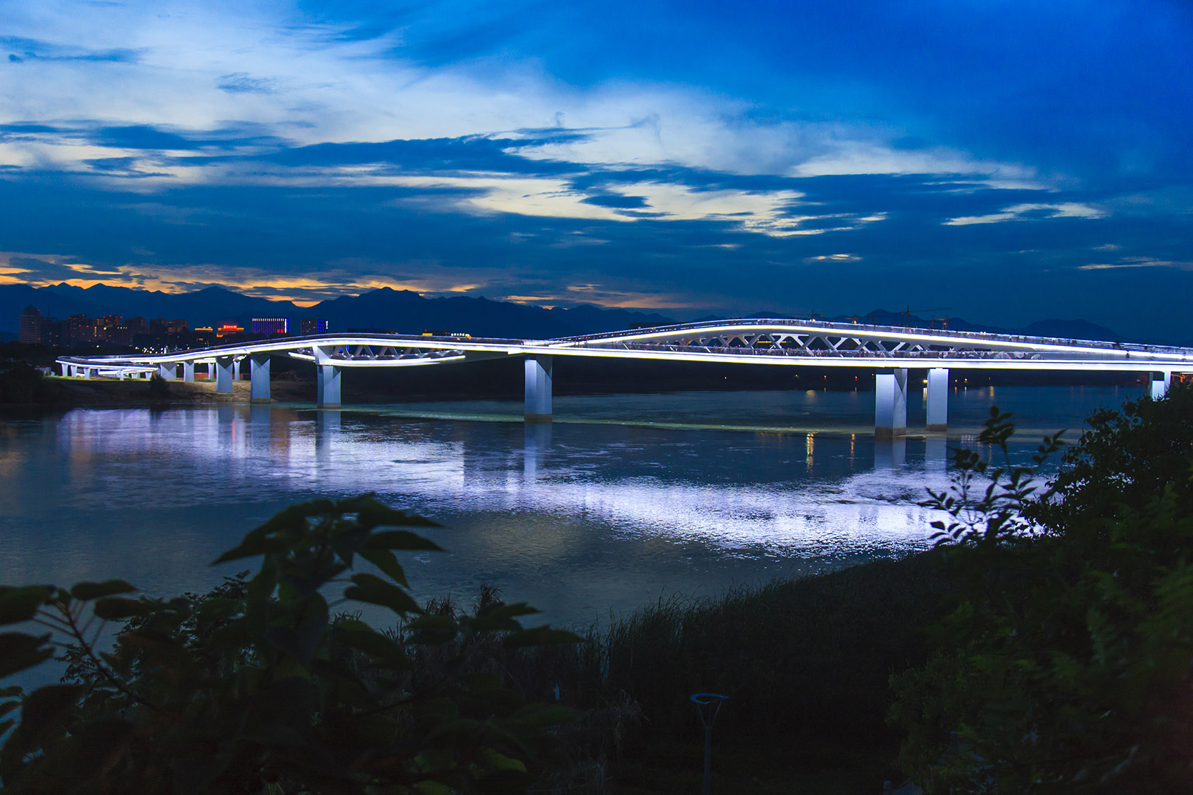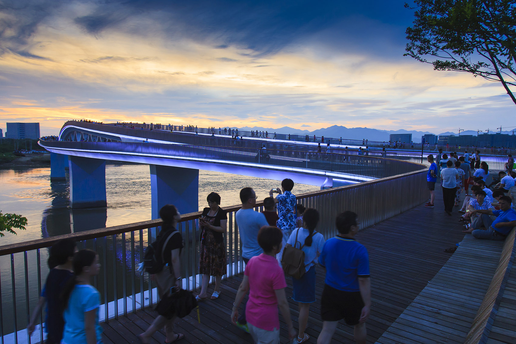 On June 28, 2017, the landscape bridge was successfully open. This energetic and novel landscape bridge has suddenly become a new route for many citizens to exercise. It takes only 9 minutes’ walk from the Peninsula Park at the east end of Ziwei South Road to South Park at the end of Jiangbin Middle Road. There is no noise and congestion all the way. In the evening, the neon reflection in the water, and the bridge body winds on Xin’an lake. The lighting aesthetics is combined with the basic elements of the bridge, such as point, line and surface, to form a lighting system with digital dynamic color system. Through the light color band of multi scene transformation, a comfortable and pleasant light environment is created for pedestrians at night, and a bright and charming water light scenery highlights Qujiang River at night.