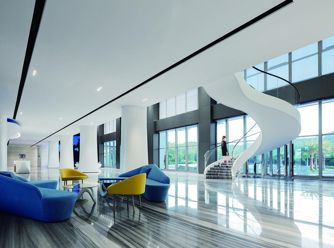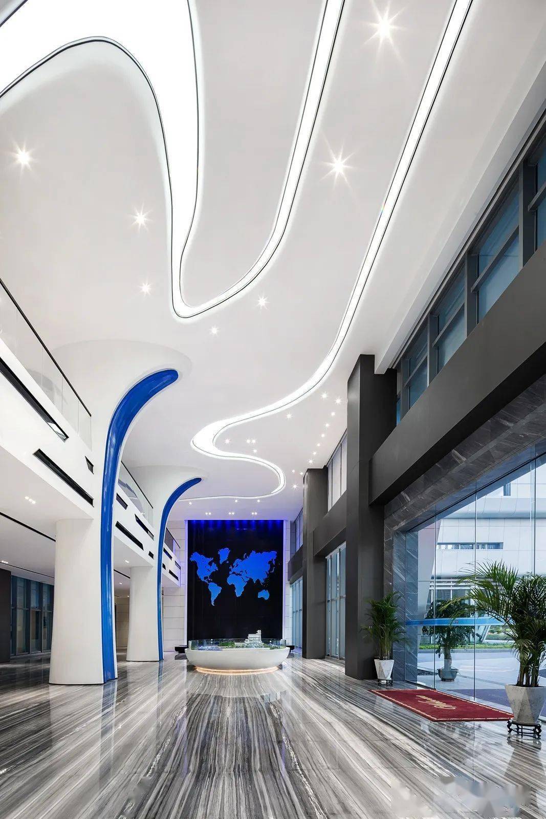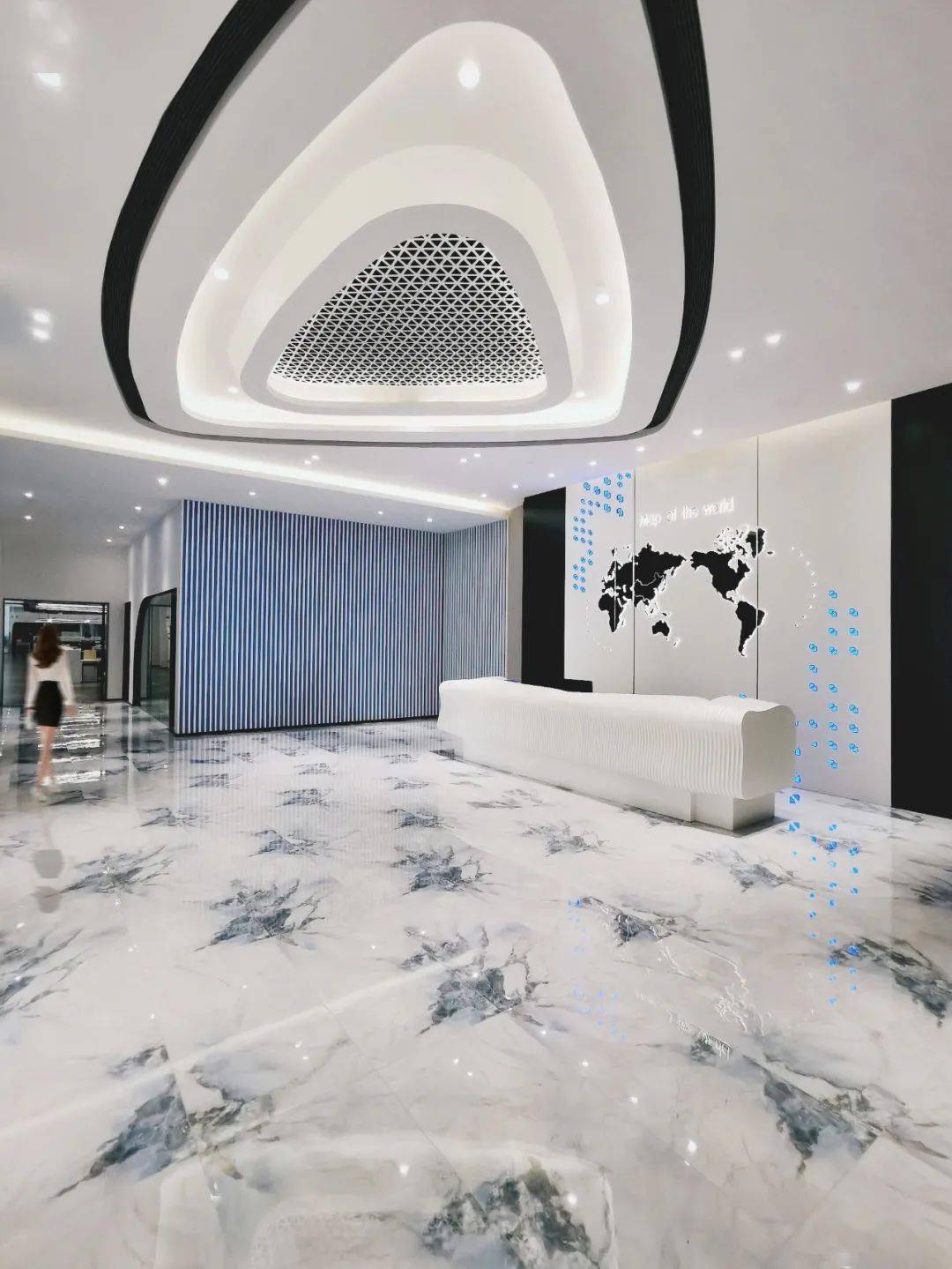 From the perspective of design, the horizontal plane planning to the vertical shape of the sky, wall and ground give full play to the high-tech design language. The ups and downs and flows of the streamline symbolize the bearing and continuous progress of the enterprise. The simple hard decoration, the removal of excessive decoration, the unique front desk design, and the soft lines of the rotating stairs highlight the rise of power.
