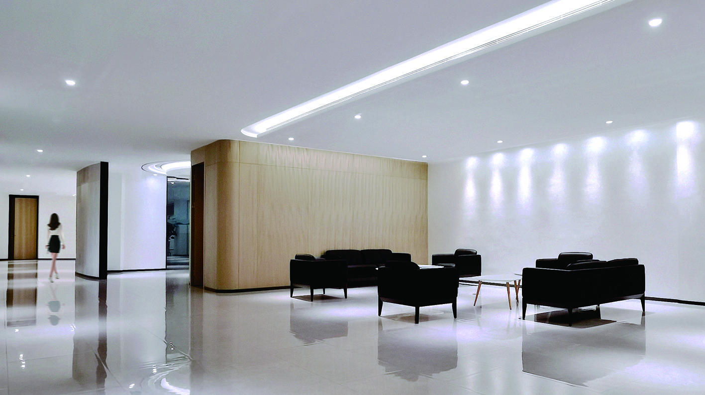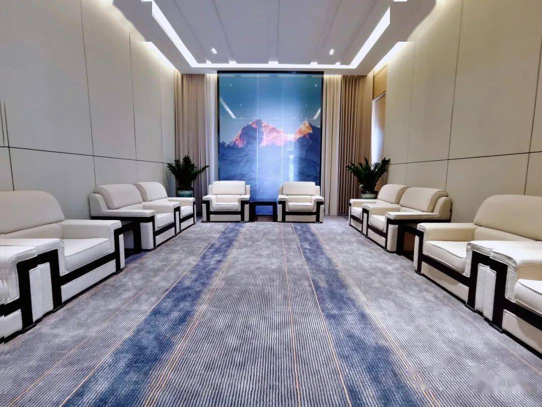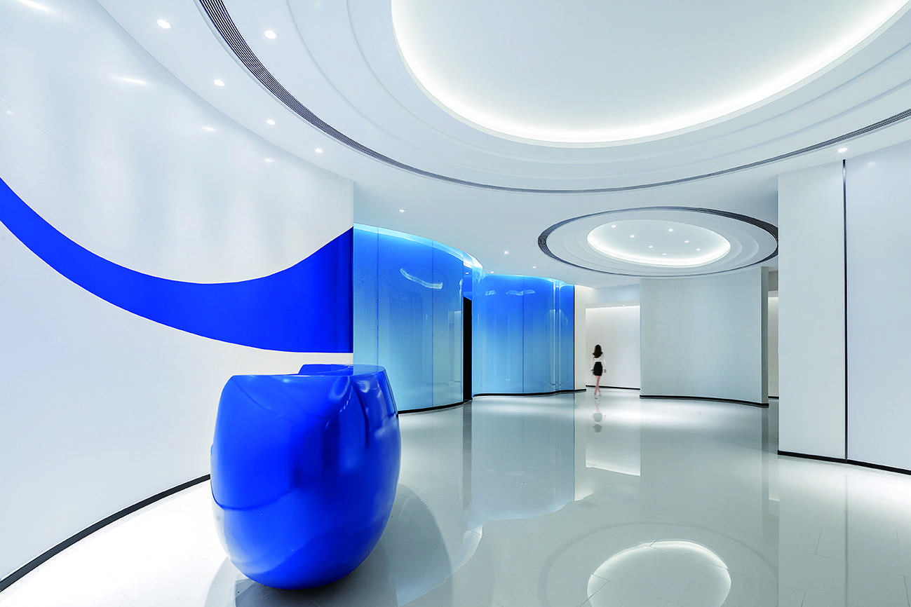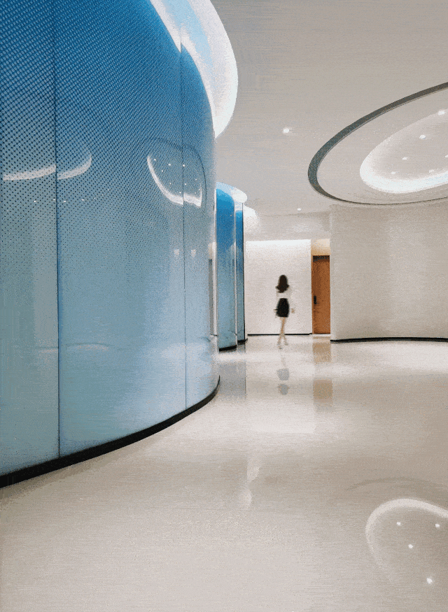 The lobby on the first floor is mainly designed with streamline artistic modeling. The large area of elegant white is embedded with quiet ocean blue. The standing columns run through the first and second floors with immeasurable tension. The momentum is magnificent and complements the design soul of the building itself. Through the streamline light belt like flowing water, the "quiet" is changed into "moving", flowing with freedom, comfort, tranquility and calmness. It has jumped like a pleasant note, adding flexibility and vitality to the space. The modeling of water curtain wall cruising in elegant white and ocean blue implies that strong vitality surges out and has a long history.