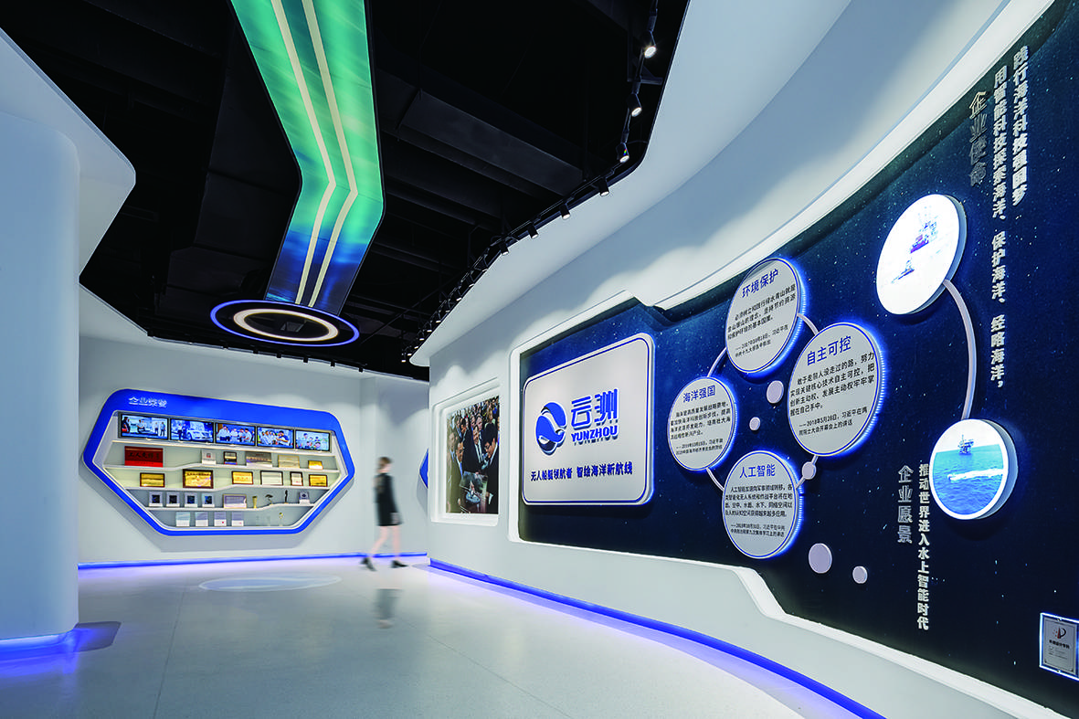 During the interior design, luozhongji had in-depth communication and cooperation with Academician Meng Jianmin, striving to achieve internal and external unity. The appearance of the building is like two new ships floating on the wharf waiting for a long voyage, which has become a new landmark of Zhuhai. According to the functional positioning of the unmanned ship base, Luo Zhongji combines the corporate culture elements of Zhuhai Yunzhou Intelligent Technology Co., Ltd., takes "water" as the design source, adopts streamline design techniques, and uses the design language of "diversity, inclusiveness, and ocean" to create a modern office and exhibition space with a sense of science and technology and an international vision.