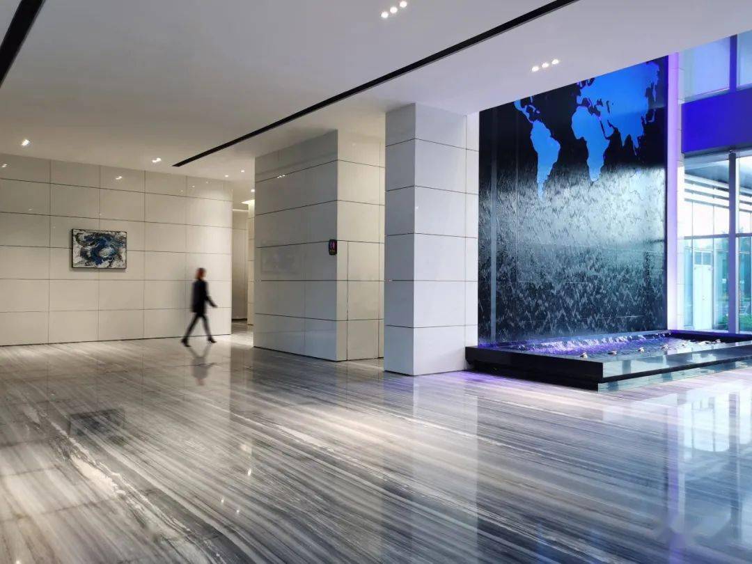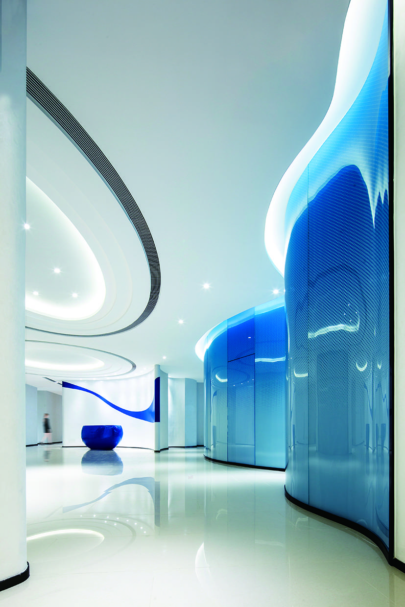 一层大堂主要以流线艺术造型为设计主调,大面积的优雅白中嵌着静谧的海洋蓝,屹立的隽秀柱体,以不可估量的张力贯穿一二层,气势恢弘,与建筑本身的设计灵魂相得益彰。通过流水般的流线灯带化“静”为“动”,流淌着自由、惬意、恬静、从容,已如愉悦的音符欢快地跳跃,为空间增添了灵动与活力。游弋于优雅白与海洋蓝之中的水幕墙造型,寓意强大的生命力奔涌而出,源远流长。