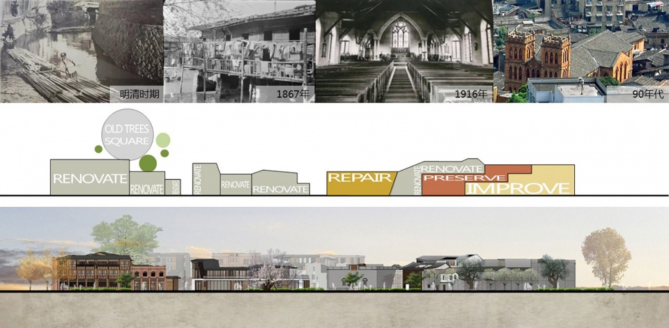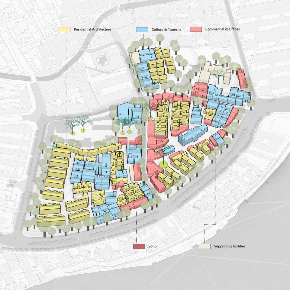 苍霞所积淀的文化本就是不同时代新旧共生的交叠。用“城市拼贴”手法来处理新旧建筑的空间关系。既非强调结果的“现代化街区”,也非追溯源头的“古建保护区”,而是通过富有时代感的重组整合,让城市的历史结构参与到当下与未来的城市发展中。