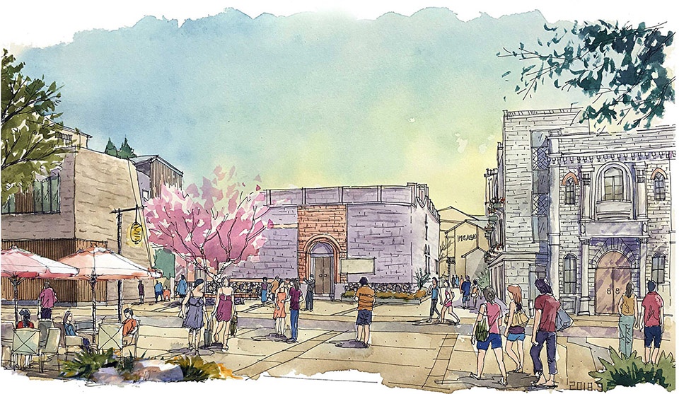 为再现苍霞基督教堂“玉带环腰”的意境,用镜面+浅水的方式环绕教堂设置景观带,映射周围的街道屋舍、往来行人。用景观互动的设计手法,在相同的坐标位置,与历史景象产生微妙的重叠。