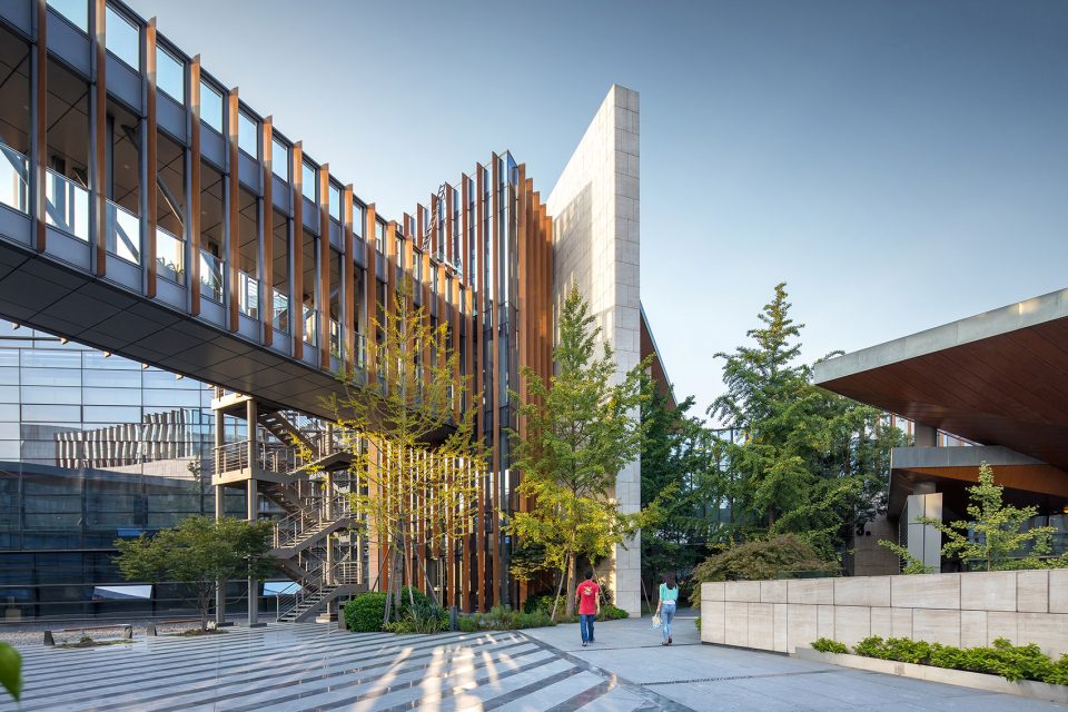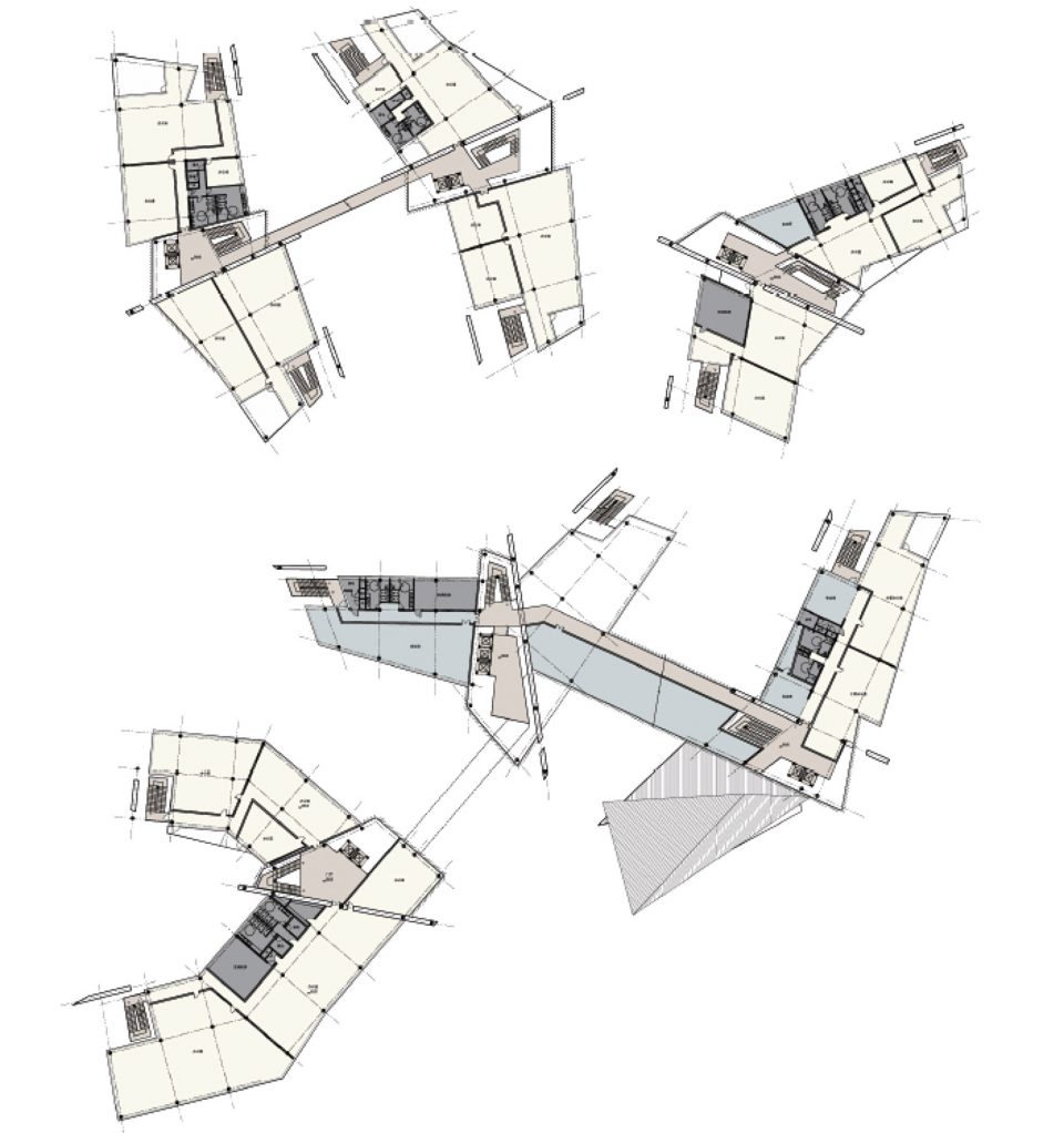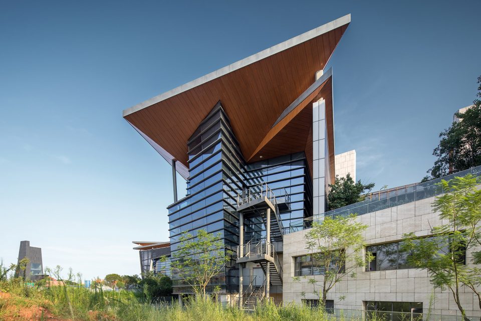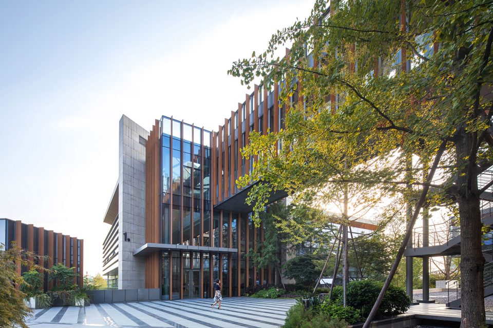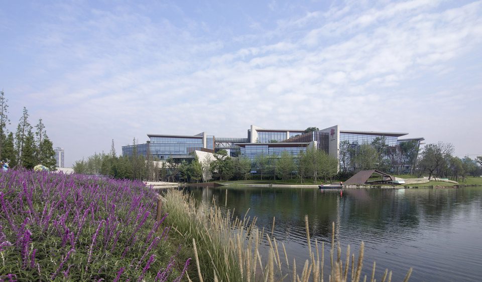 The headquarters park includes offices, conference centers, an exhibition hall, an auditorium, a staffs cafeteria, leisure environments and other functions. The main concept of the design is simple—collaborative office spaces are located in a way to give the most possible views, for those inside, of the surrounding lake and eco-city landscape. Based on thorough research on the entire 3D design model, the office and conference functions are divided into six towers with a three to five floor layout, supporting functions, such as parking spaces, are provided on the two underground podium floors. The outline of the building is consistent with the varying topography of the lake islands. This design allows for greatest possible amount of natural daylight.