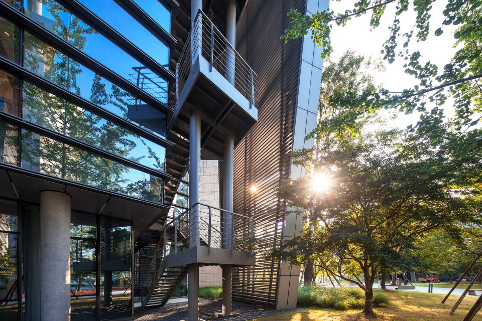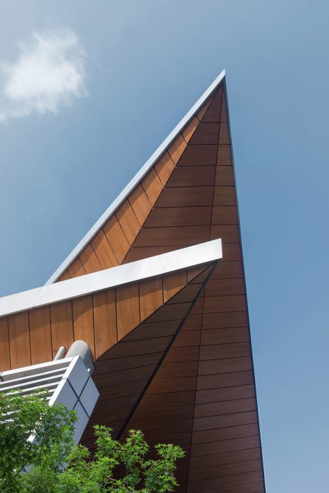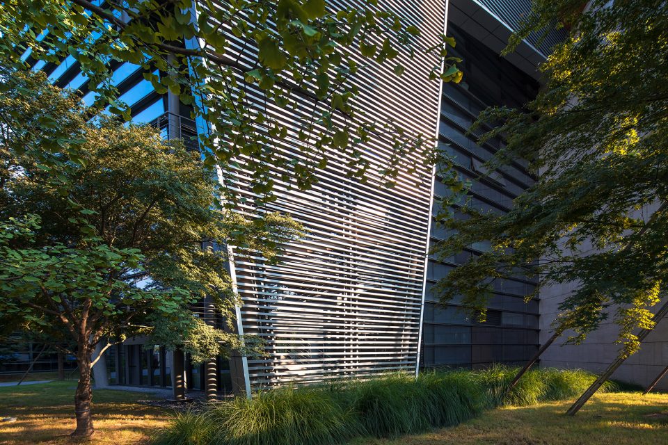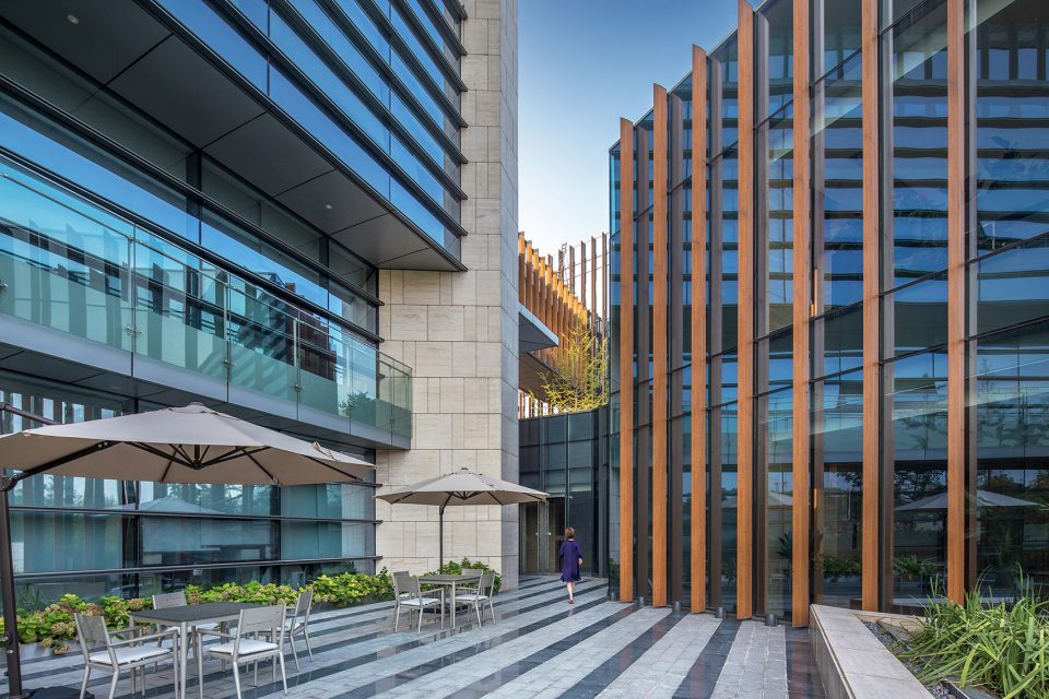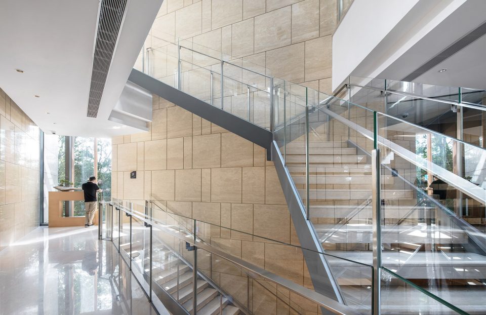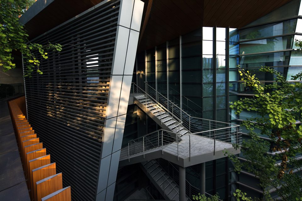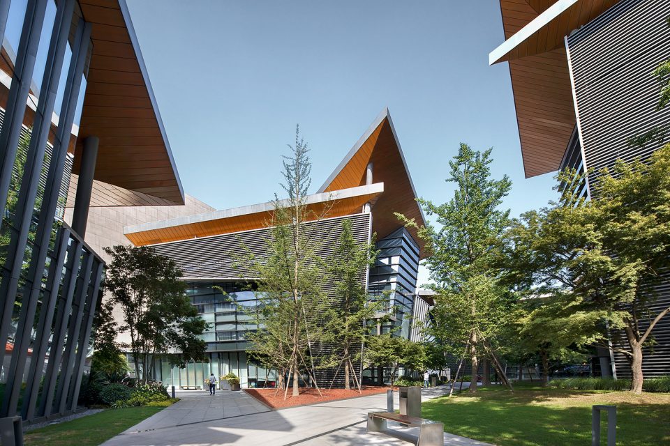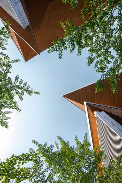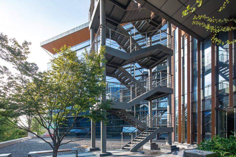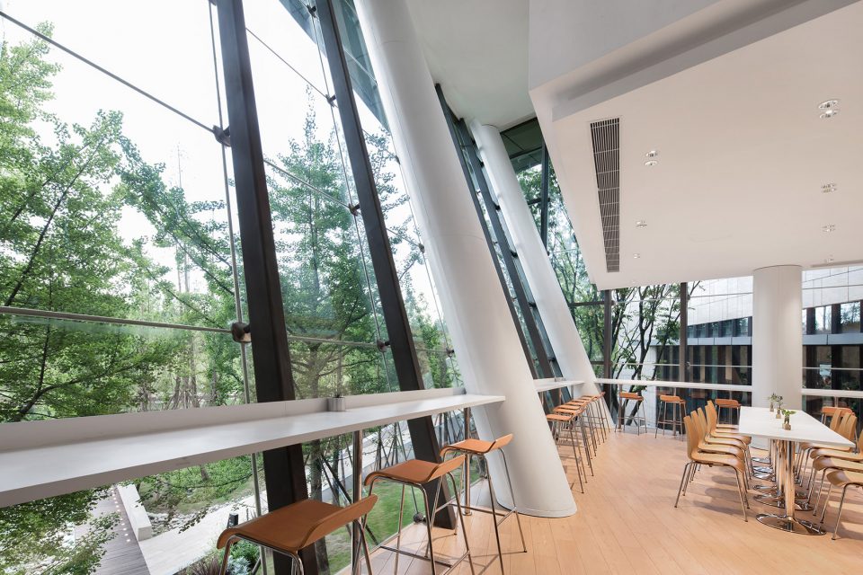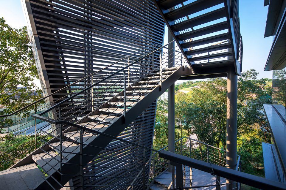 Walking through the park, the height of the building is deliberately reduced in order to properly view the tops of the surrounding trees. The design of the glass curtain wall has the effect of reflecting the surrounding environment, the shading of the asymmetric steel staircase gives a strong lighting and shadow contrast, the low reflective zinc roof provides a blurring of the landscape and cityscape beyond, all of which brings together a mingling of urban and landscape design. The whole office building is designed in order to emulate the surrounding terrain. From the interior, the multiple departments are distributed into the six buildings, connected with bridges and outdoor staircases and then the base into a whole. The half-buried terrain architecture, in addition to working in concert with the varying topography of the surrounding islands, also raises up the surface of the parking garage, staff dining room and reception center; furthermore, providing a complete set of functions for the headquarters office.