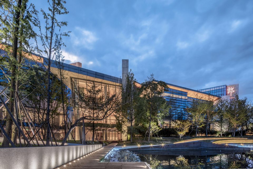 The Langjiu Headquarters, based out of the southern suburb of Chengdu known as Luhu Community, has been in open and occupied since early 2017. The project site is truly exceptional, and has been undergoing rapid improvement for the past ten years. Located at the core of the southern Chengdu suburb called the Luhu Eco-City, the site was originally farm land; but after undergoing substantial site work and irrigation the land was transformed into a finger lake dotted with small islands, all of which are connected with bridges and boats. One of the unique features of this site is that this eco-city is a wetland for migrating birds. The dynamic characteristic of the bird and its wings can be seen reflected in the “soaring” aspirations as that of the client- Langjiu Group. The headquarters design incorporates the special qualities of the bird in its design.