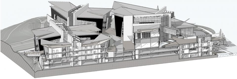 本案于2007年启动设计,是当时在中国西南地区首次完整应用BIM-Revit信息化建模设计的项目,先进三维的设计手段成功地实现了建筑师精确地对山地上复杂造型的施工控制。