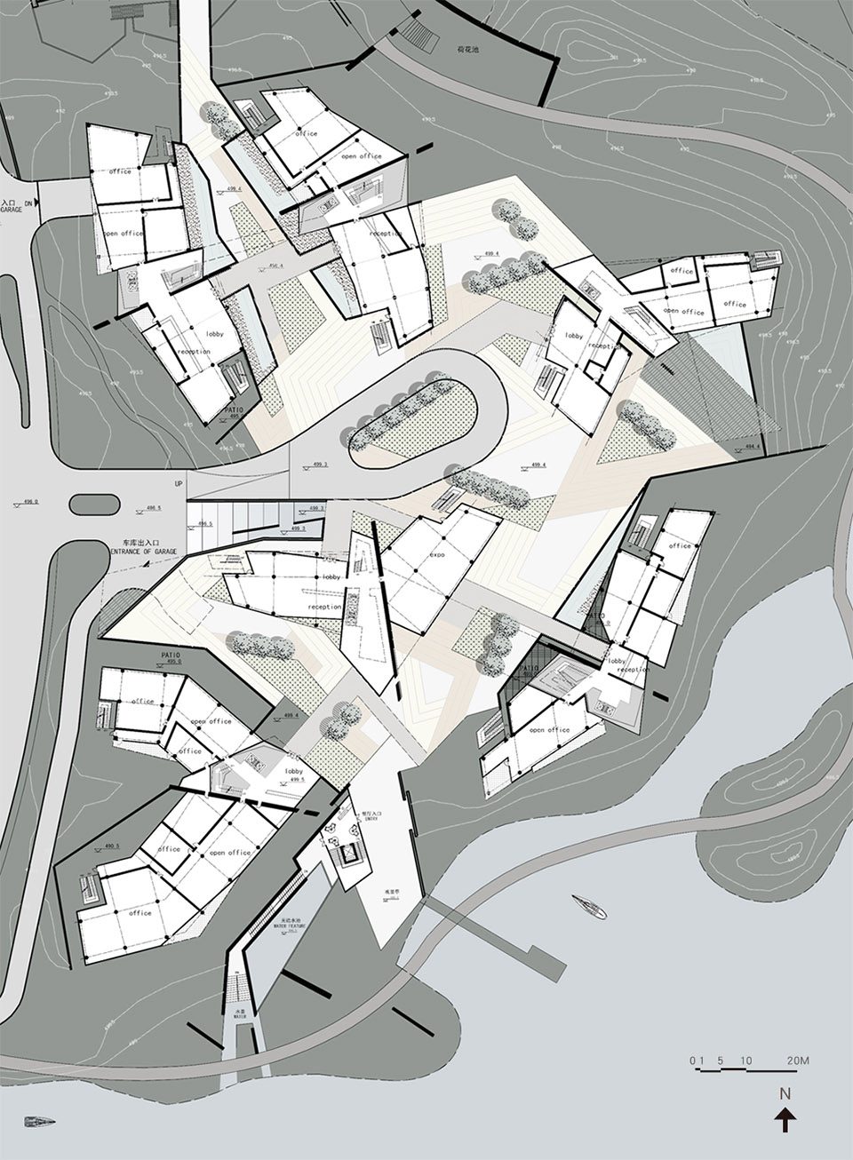 总部园区包括办公,会务,展厅,报告厅,员工餐厅,休闲配套等完整功能,遵循规划布局原则是:内部资源分配上为主要办公区争取最大看湖景观面;与外部环境则是建筑体量碎片化与景观化。通过实体模型研究,把办公及会务功能分为六幢3~5层楼布置,配套功能及停车设置在两层地库中,建筑轮廓追随地形高差沿湖错落起伏,保持岛屿形态下,也争取最大的自然采光面。
