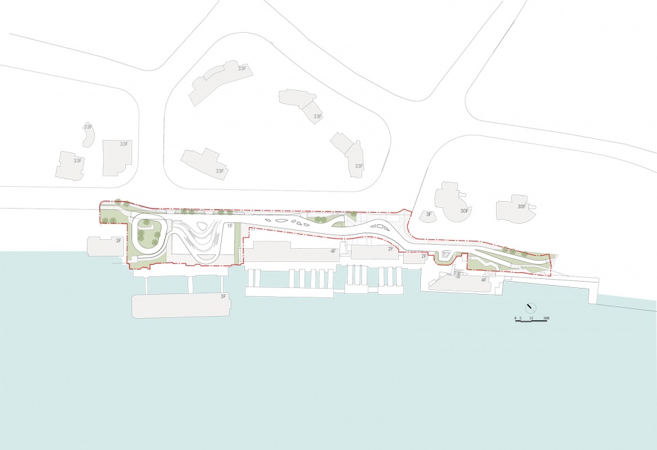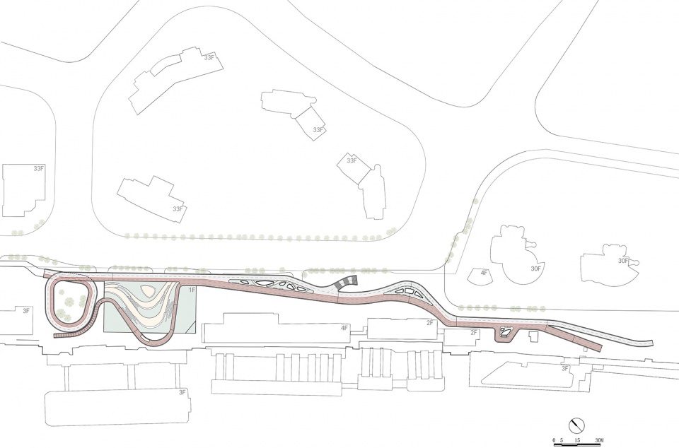 The whole passage can be divided into five distinctive and well integrated sections from south to north. The south approach bridge section bifurcates running and cycling paths, reducing the size of passage and winding through the dense greenbelt along the riverside. Before accessing to the front square section of Ferry Terminal, an enlarged platform is set up protruding toward the river, which offers a good river view among buildings for the passing people to stop and to rest, as there are flower beds, awnings and chairs on the platform.