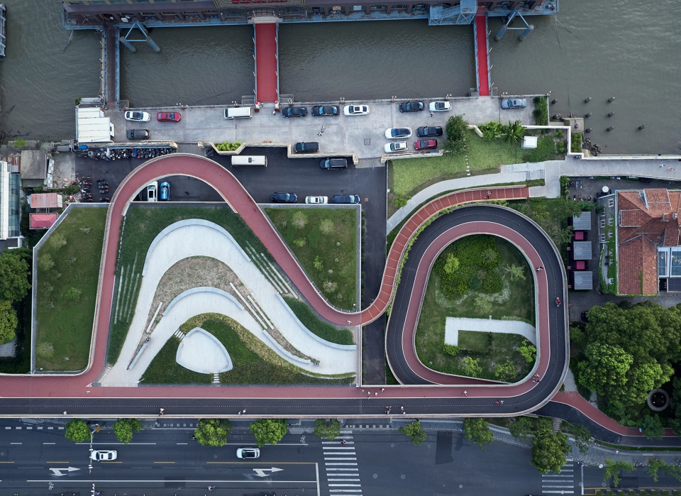 Further north is the Fudu Greenbelt Platform section facing a seafood floating restaurant. By taking advantage of the greater depth of the site, a large overhead greenbelt platform with a public parking lot underneath is built to satisfy the three-dimensional composite request in the planning scheme of Huangpu riverside connection of Lujiazui area. While ensuring the two paths going through the platform, a running and walking path is designed to greatly detour to the riverside, and then a 9-meter overhanging C-shaped hollow suspension loop is formed on the platform. Although the river view is still temporarily blocked by the floating restaurant, the overhanging loop broadens it to a better extent. The landscape facilities in the middle of the platform conform to the dual features of straight and curved paths on both sides, and use the gradual curvature as design language to create streamlined features.