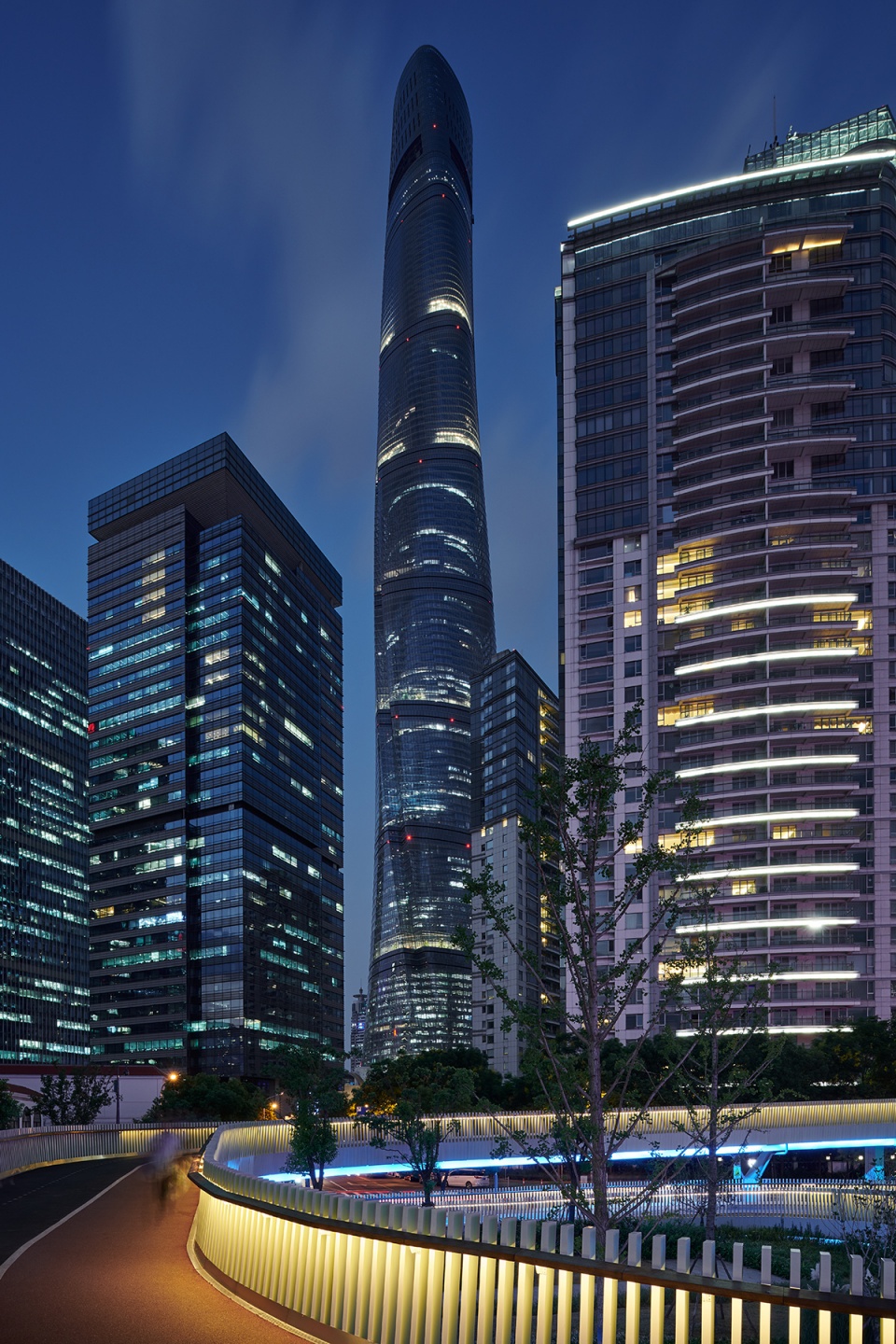 The north approach bridge section boasts the widest city view. A large 360 degree spiral ring path is set up to invite the citizens to a fantastic urban experience in which the scene is always changing with walking, looking up to the three famous skyscrapers in Lujiazui centre area or overlooking the Bund; outside of the ring path, there is also a step footpath directly connected with the river-facing walkway to the north side, which is drawn from the walking path of the platform section. Together with the ring path, it becomes an excellent view point to watch Huangpu River sunset facing the historic BUND.