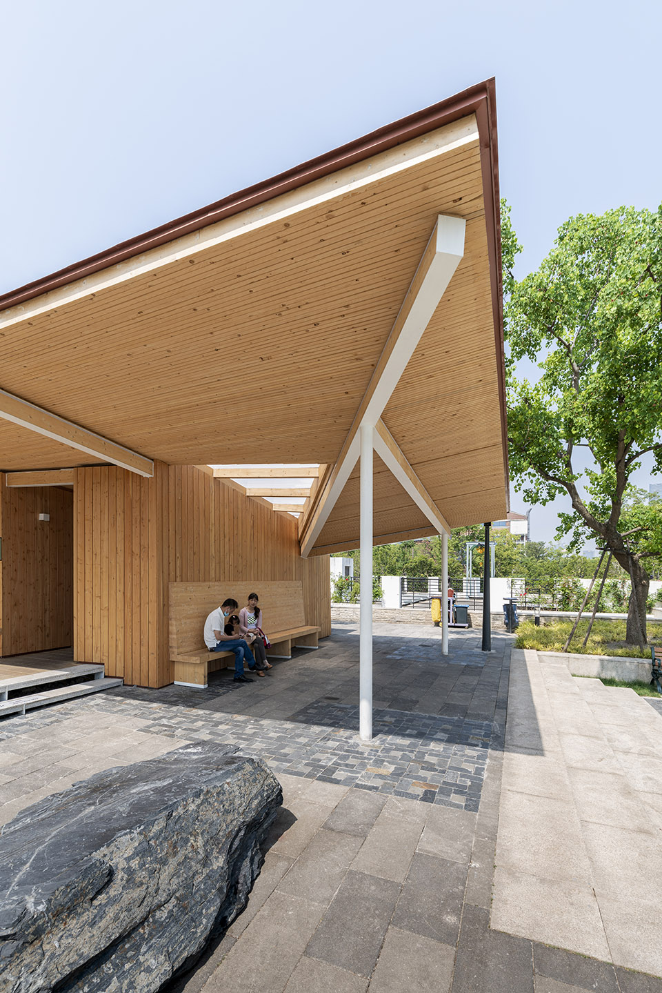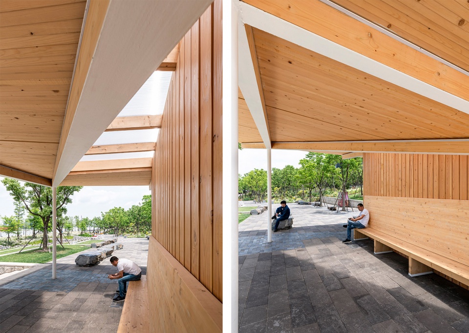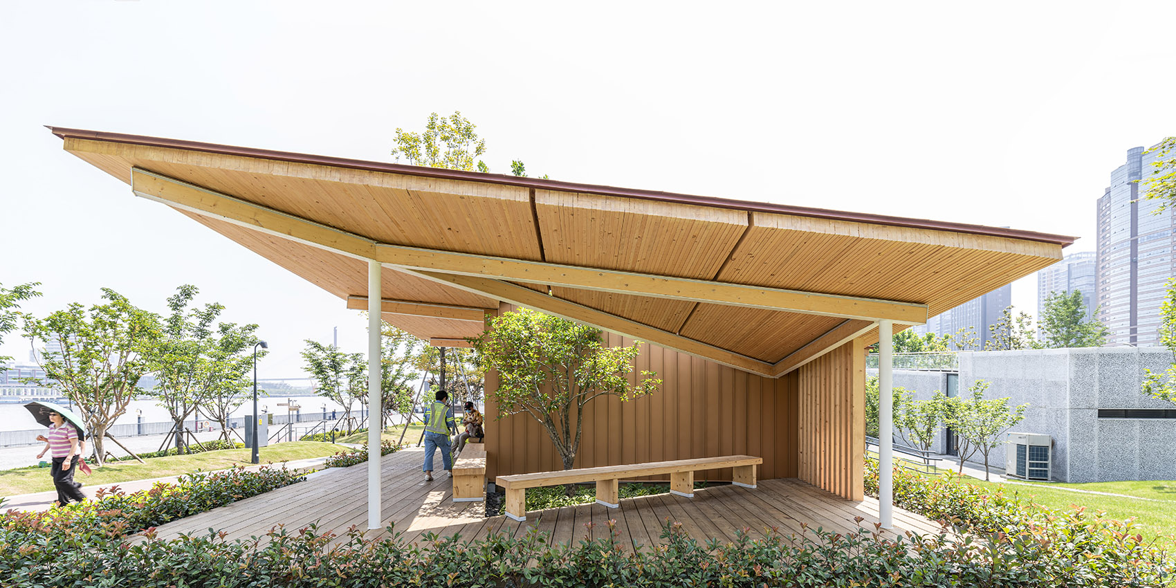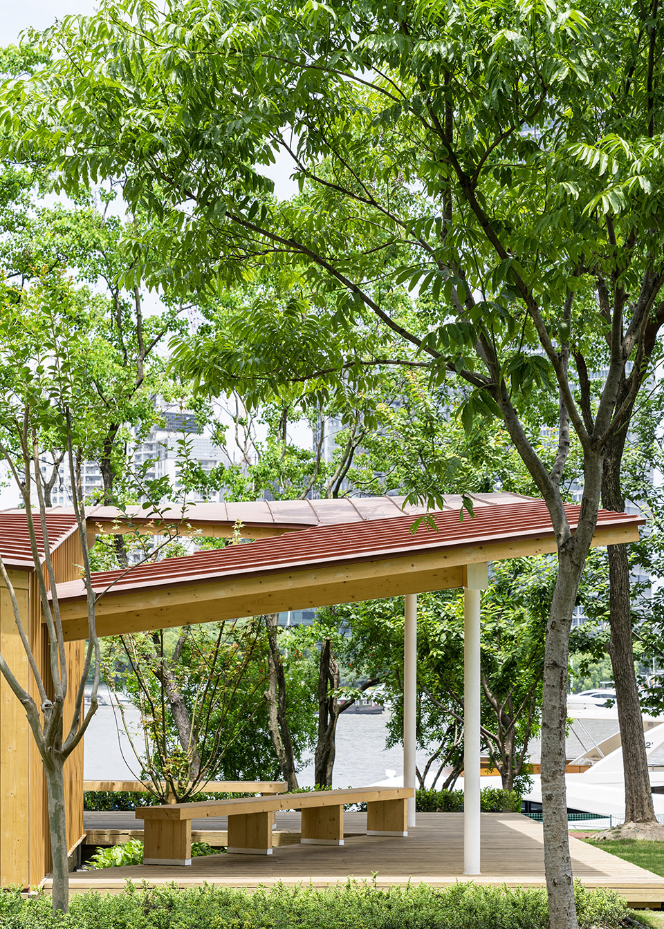 The kiosk is directly set on the original pavement rather than being overhung. The triangle patio is covered with poly-carbonate panel as a skylight. The river-view long bench against the enclosure of the restroom is set below the skylight. This design not only has enlarged effective space of rest kiosk but also has considered both passersby and visitors who want refreshing rest and to admire the scenery in such an excellent river view platform.