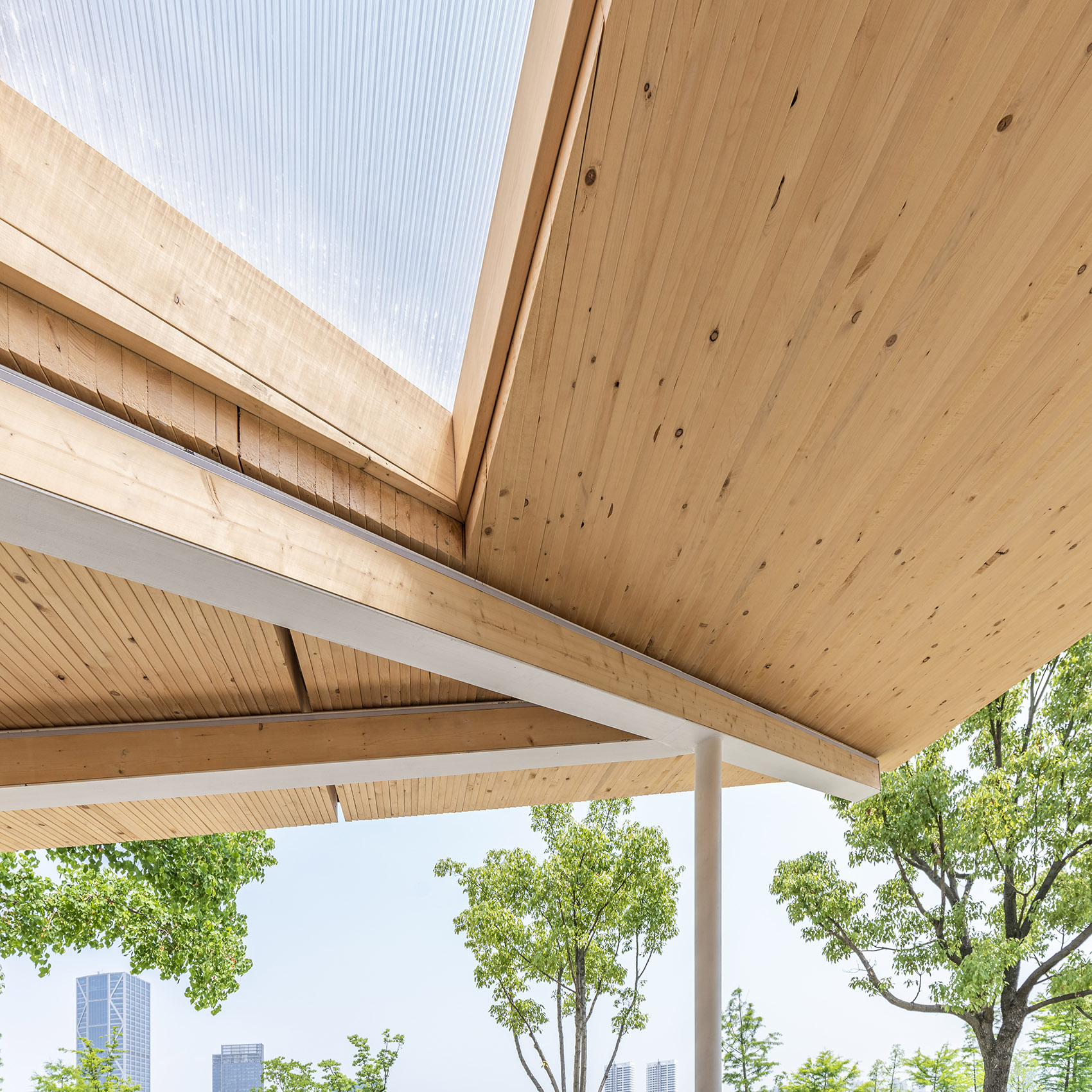 Primary Materials: NLT (Nail Laminated Timber) Roofing System of Douglas Fir, Steel Profile, Douglas Fir Siding, Al-Mg-Mn Alloy Sheeting, Pre-coated Aluminium Profile, Slab Glass, Timber Pavement, Ceramic Tile, Poly-carbonate Panel
