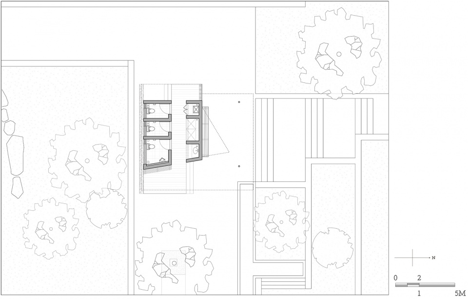 No.3 kiosk is located on a small rigid paving hathpace at the end of the terrace garden and Moon Bay valley. The site, where three riverside tracks meet, is designed in face of riverside view with a set of big steps and completely occupied by the Service Kiosk. Hence, the Kiosk is designed by rotating 90 degrees, so that the restroom is moved close to the boundary of the retaining wall at the back of the site and the rest area on the hathpace is turned into an observation deck surrounded on three sides by river view.