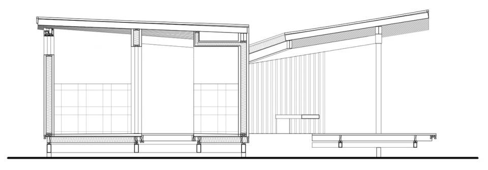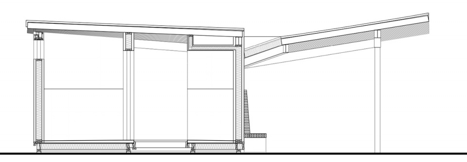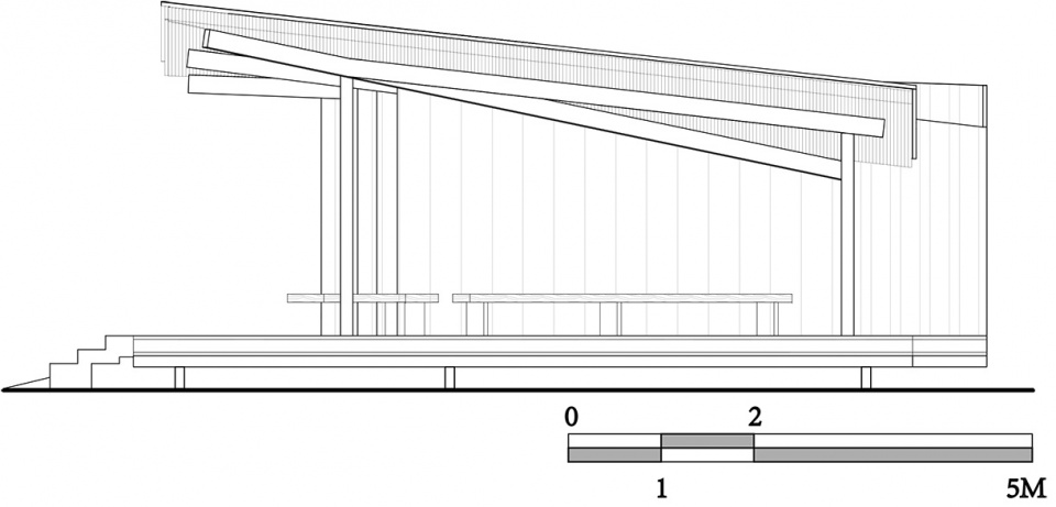 Due to a significant reduction in building scale, the height of the cornice must be lowered. As a result, the unidirectional purlin roof used in River View Service Station will be too thick. Therefore, to make a more direct expression on structure and tectonics, a seemingly lighter (actually heavier) NLT flat roof system is adopted. Also, some exposed side wood-paneled main steel beams are used as a visual transition between roof and columns.