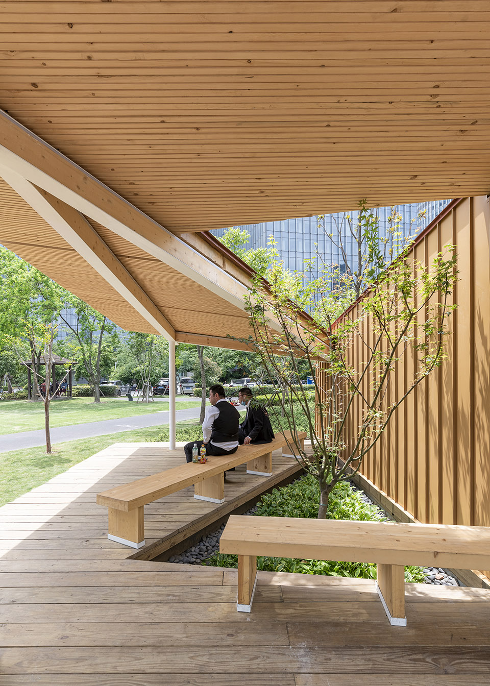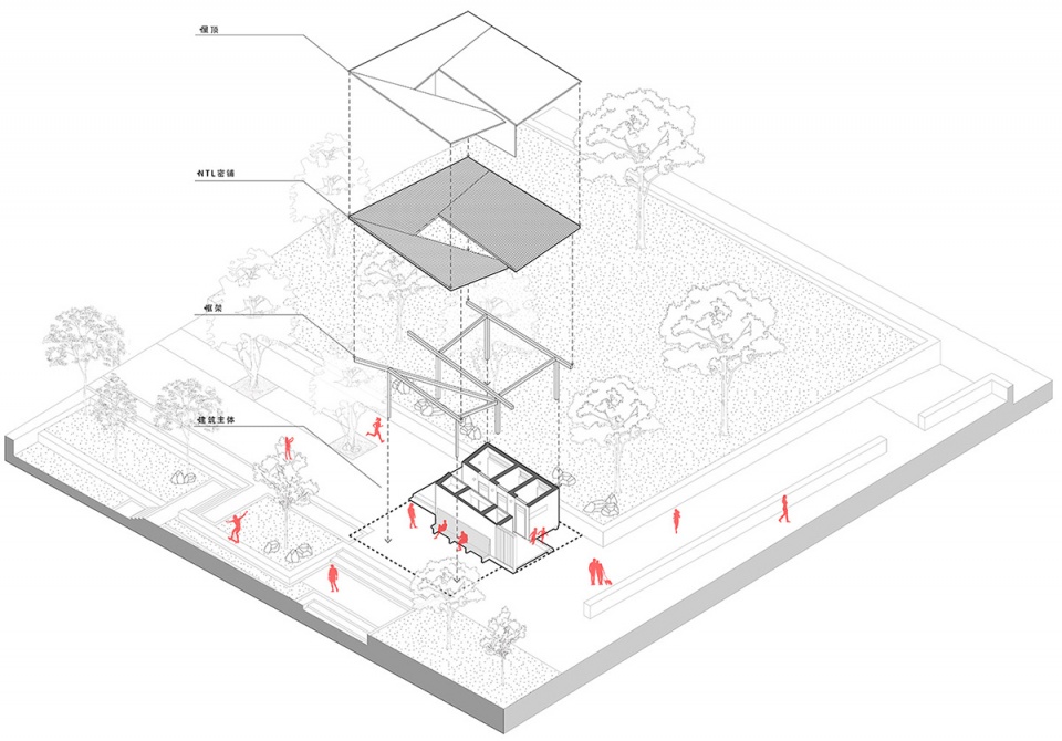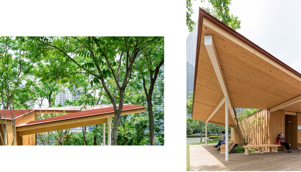 我们取消了休息区的架空平台,让它直接落在场地原铺装上,同时把三角形天井用阳光板封成天窗,天窗下靠卫生间背墙布置通长面江座椅,这样既扩大了休息亭的有效面积,兼顾了亭下的通过人流与休息人群,又使休息者能在这处绝佳的观江景点以被庇护的方式与风景相关联