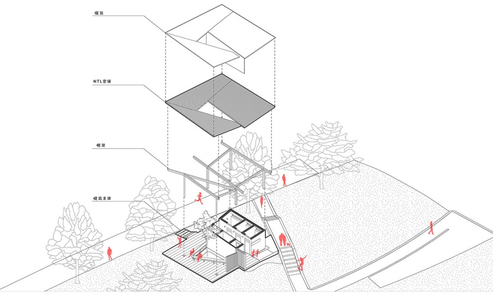 驿亭延续望江驿标准化的适应快速建造的轻型建筑形制及结构、材料特征,并适当优化。驿亭卫生间与休息亭的空间并置关系继承自望江驿,依然沿用钢木混合结构体系以及围绕天井向内单向缓坡的半螺旋直纹曲面的出檐屋顶。但休息区取消围护结构之后不能再如望江驿那样利用窗框作为龙骨状竖向结构,我们设置了两根纤细的圆钢柱与卫生间的围护结构一起支撑整个屋面。