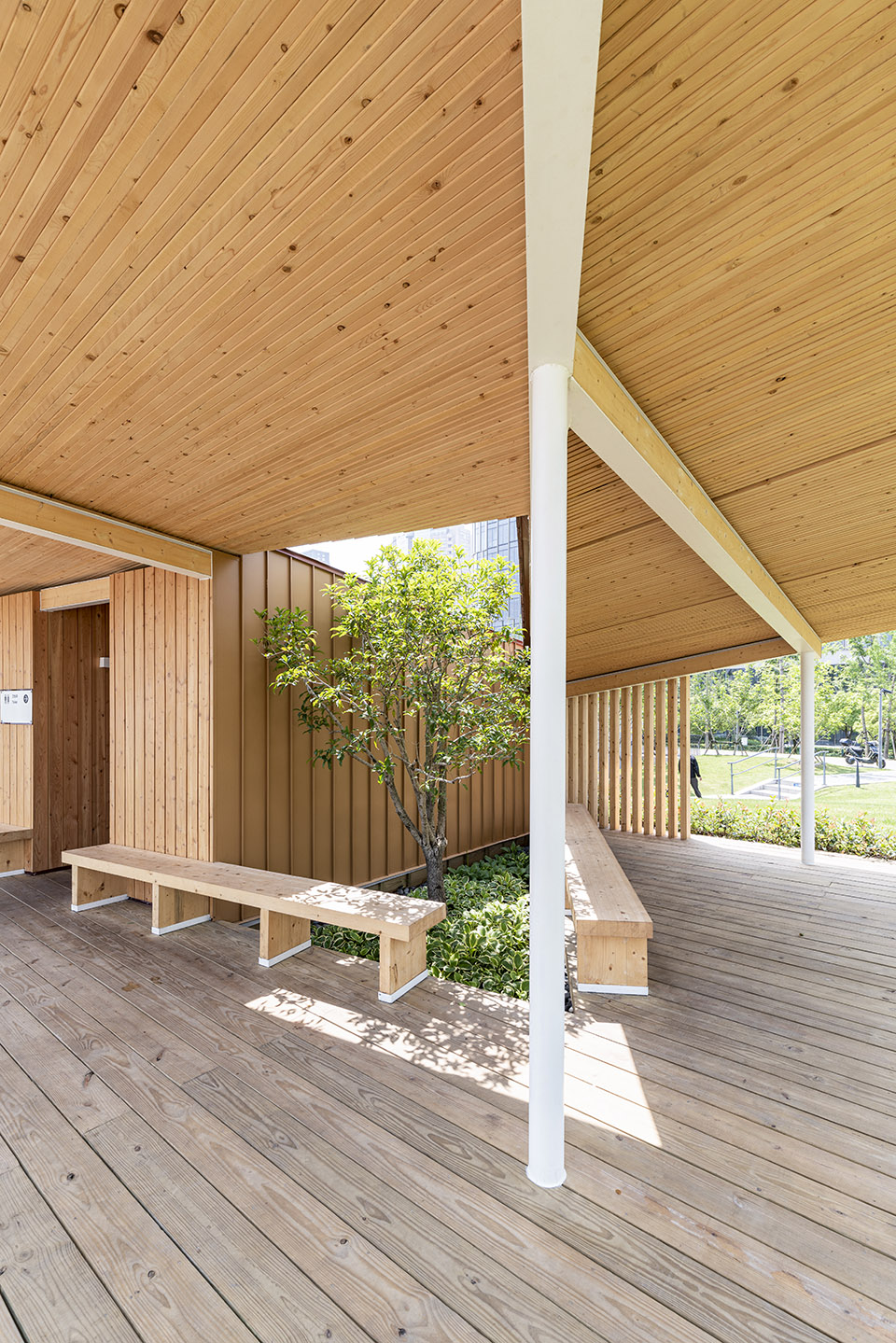 The River View Service Kiosk is appropriately optimized based on the standardized lightweight construction typeand material characteristics of the River View Service Station, which are adapted to rapid construction. It inherits the spatial juxtaposition of the restroom and rest kiosk from River View Service Station. The design continues to adopt a steel-wood mixed structure system and extended eave roof with a semi-spiral ruled surface and an inward one-way gentle slope around the top of the patio. However, since the rest area is designed without enclosure, the window frame adopted in River View Service Station can no longer be used as a joist-like vertical structure. Two slender round steel columns were set up to support the entire roof along with the restroom enclosure.