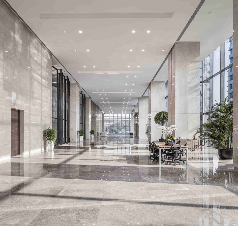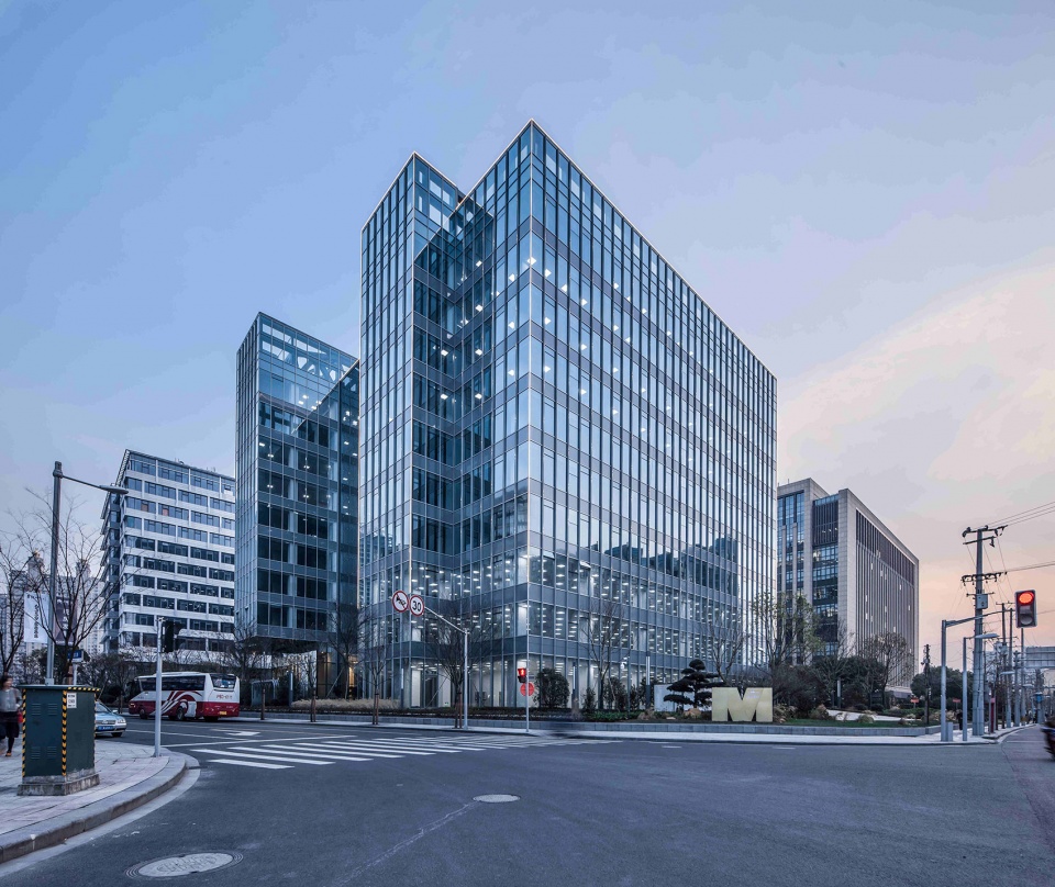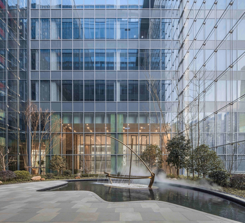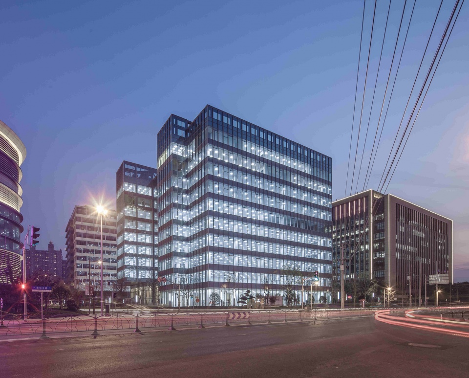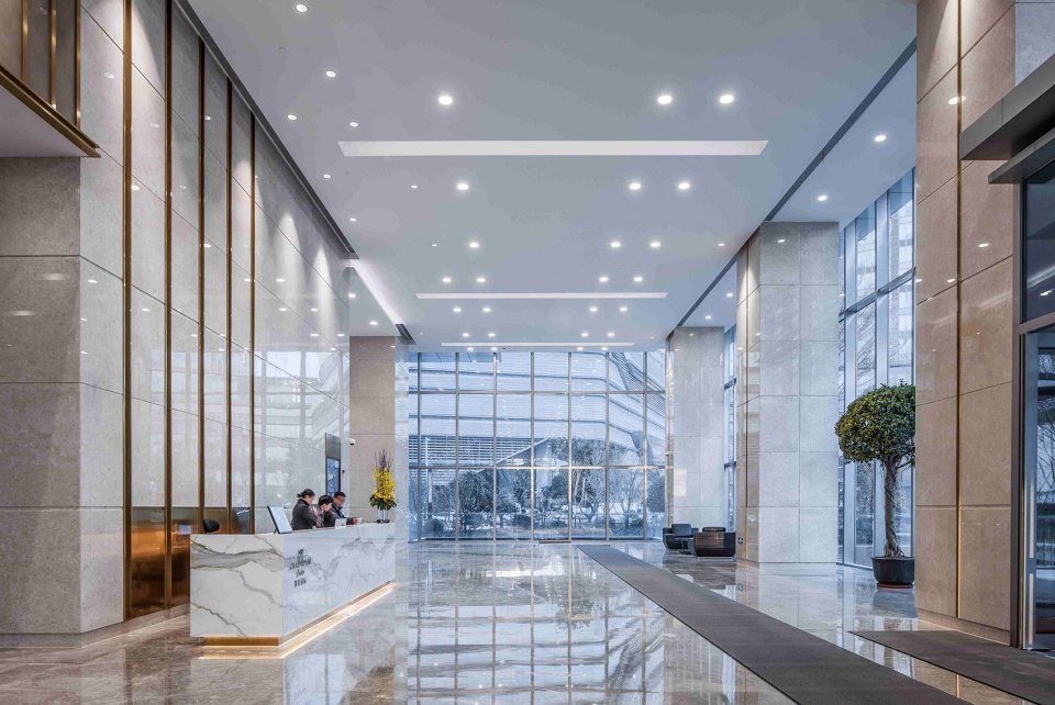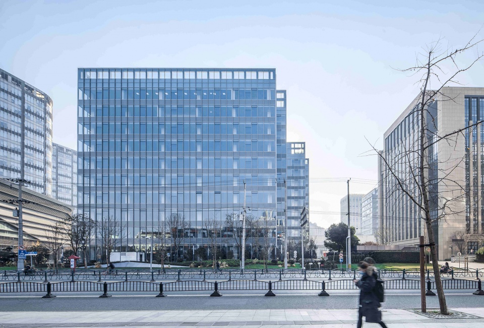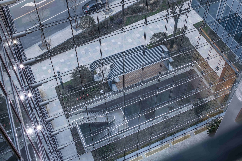 The facade material and tectonic treatment inherit the feature of the concise and transparent building. The office unit facade are all glass curtain walls equipped with vertical sun-shading boards while the interlayers are installed with roller coated aluminum plate in similar color. The hall facade on ground floor is enclosed by glass curtain walls supported by glass ribs. Frameless glass suspension curtain walls are erected as the two enclosure interfaces at the eastern and western ends of both elevator atrium and landscape atrium in same height which maximizes the penetrability of the public area. Adopting such concise and restrained design, this project is able to provide an efficient, vigorous and ecological environment for business performance as well as play a special and positive role in this region.