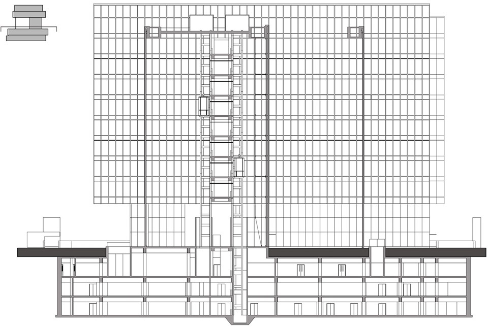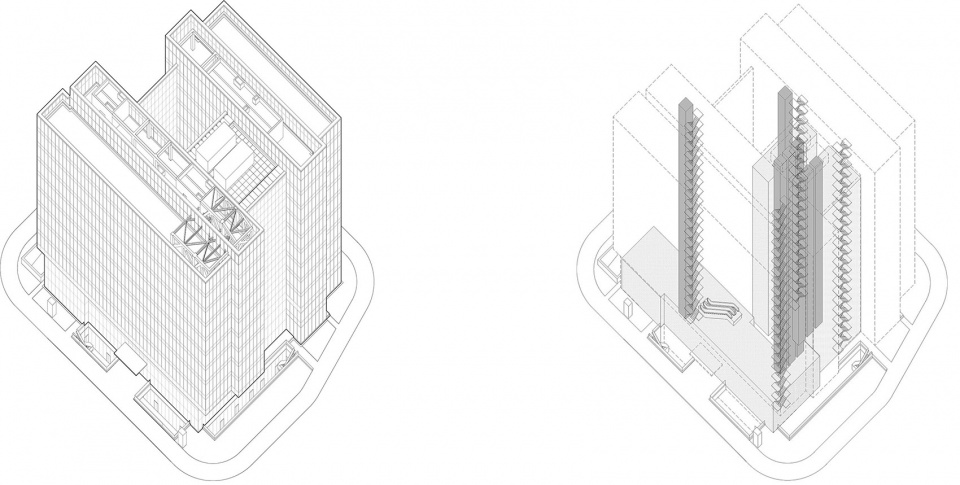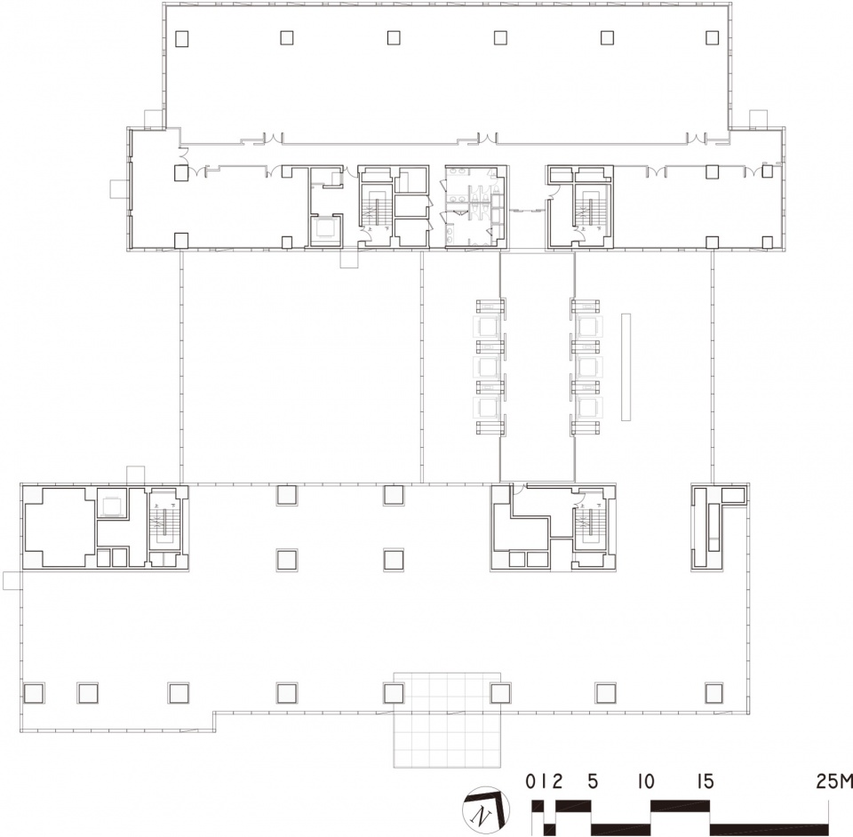 我们根据业主提出的每层最多分割为两个单元这一明确的招租定位,提出了一个“工”字型的标准层格局:南北两个偏心筒的板式办公单元通过一个坐落于通高交通中庭里的天桥式电梯厅连成一体。办公单元的使用空间进深不小于12米,同时东、西端部提供了视野更开阔、进深更大的办公空间。这样的格局使办公空间的组合将有更多的可能性和灵活性,并且创造了更好的采光通风和景观条件。南北两单元之间除了东侧的透明电梯中庭,还在西侧围合了一个户外景观中庭。这两个中庭把户内和户外联成一个整体,将传统中央核心筒办公楼的不透明实体中心转换成为一个透明的虚体中心,从而将大楼内的公共景象展现给城市,并与城市的公共生活发生关联。