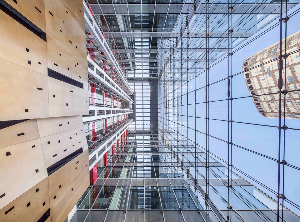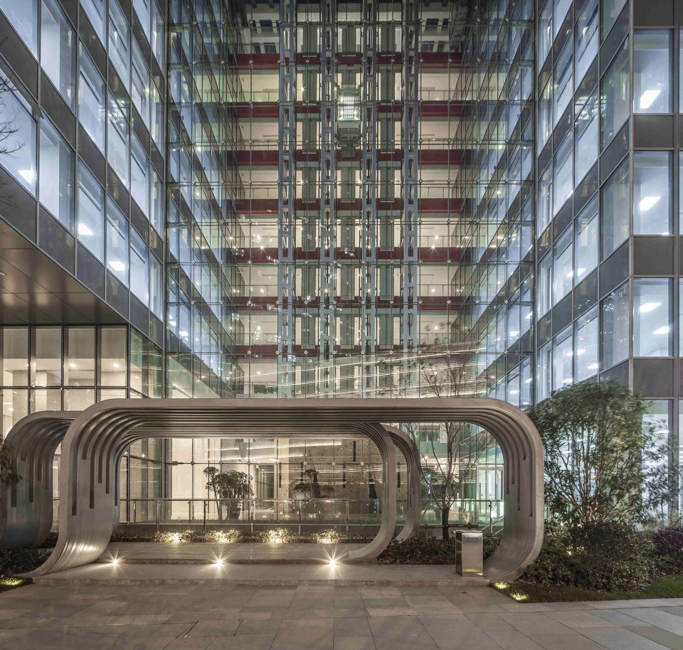 立面材料与构造的处理延续了建筑整体简洁通透的特征。办公单元外立面均为带竖向遮阳板的玻璃幕墙,层间为色彩相近的滚涂铝板。底层大堂立面采用玻璃肋支撑的全玻幕墙;而交通中庭与景观中庭的东、西两个外围护界面为通高的全玻无框悬索幕墙,突显了公共部分的最大通透性。该项目通过简洁而又克制的设计,既为高效、活跃且绿色生态的办公环境提供了可能,又为这一地区创造了一个有特征的、积极的空间节点。