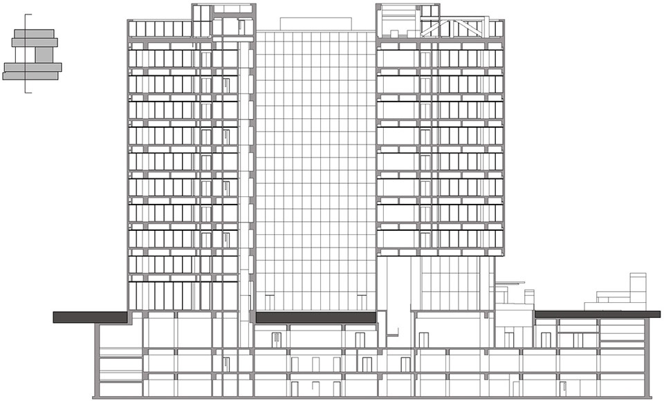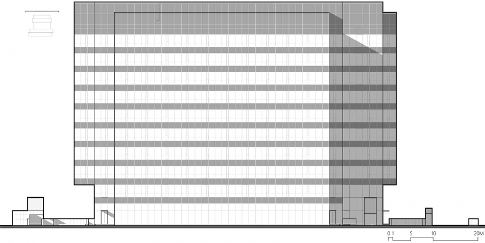 大楼南北两侧的平整界面和东西两侧的锯齿形界面回应了建筑与场地的不同关系。我们在大楼东南角将门厅界面与中庭取平,从而形成了南侧办公单元上部体量深达7.5米的悬挂式出挑,这样面向城市树立了独特的公共姿态,并更好地引导视线与人流进入南侧的主入口。南侧办公单元底部是两层通高的门厅大堂,折向北与45米通高的电梯中庭联成一体。此外,通过在建筑外围沿东、南两侧设置通长的L型下沉庭院,以及在景观中庭内与水池结合的玻璃顶采光顶,为地下一层的多功能空间带来了充足的自然采光与通风。
