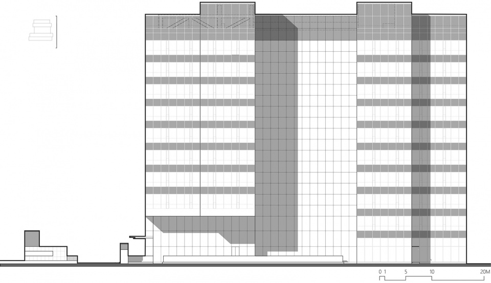 The purpose of this project includes two aspects. One is how to add space and interface which is positive and open to this area on the city scale. The other is how to create a business environment that is benefit for social communication and ecological sustainability on the architectural scale. The pivot for the two above aspects lies on the research of the office space model as well as the possibility of the new office space environment to provide better interaction between architectures and city. At the beginning of the design, we compared many plans and persuaded the owners to abandon their strong advocates for the central core tower mode. As an office building covering a standard floor area of 2,500m2, the central core-tube model is ought to be an efficient and reasonable option. However, compared to other standard office buildings that are already built or yet being built around for large property developers, this project will not be superior in space and other conditions if it continues such traditional office building mode since Fordism. Furthermore, if doing so, the 45-meter high single large-scale volume will not only lack a good external visual proportions but also cannot bring a positive relationship between the internal and external space of the large-scale homogeneous business area.