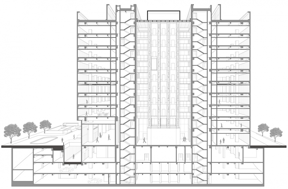 The flat interface at both north and south side and the serrated interface at both east and west side reflect a different relationship between building and site. We make the entrance hall interface at southeast in alignment with the atrium so as to form a 7.5-meter deep suspending volume of the upper office unit, which does not just show its distinctiveness to the city but also works as a beacon to guide people better to its southern entrance. At the base of the south-side office building there is a two-floor high entrance hall which stretches to the north until reaching a 45-meter high elevator atrium. Besides, with the ‘L’-shaped sunken garden going along with the east and south around the building and the pool-combined glass roof in landscape atrium, more natural light and air will be brought to the multi-purpose space on basement one.